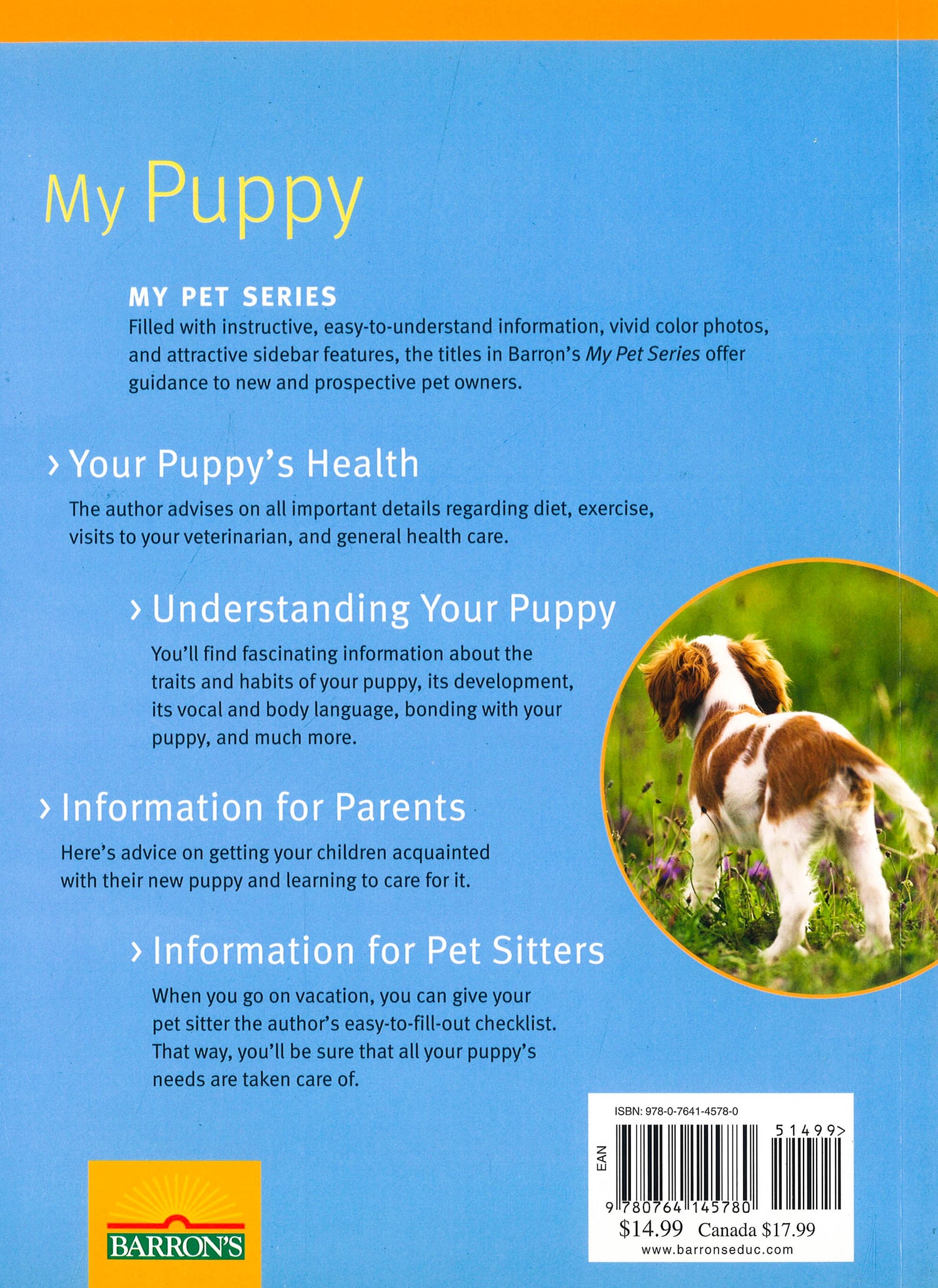 Titles in Barron's growing "My Pet Series" emphasize the special relationships that normally develop between pets of various species and their owners. "My Puppy "discusses the special care required during the first year of every dog's life. Puppies are more active and usually more playful than mature dogs, but they are also more vulnerable and accident-prone. Puppyhood is also the ideal time to begin proper training, and to achieve close bonding between master and dog. This book discusses all aspects of a puppy's growth, health and dietary needs, and advises on training, grooming, and playtime activities. The clearly written text is accessible to older children as well as adults, and is complemented with attractive color photos on most pages. The front and back cover flaps feature checklists and factual summaries of puppy-care information.