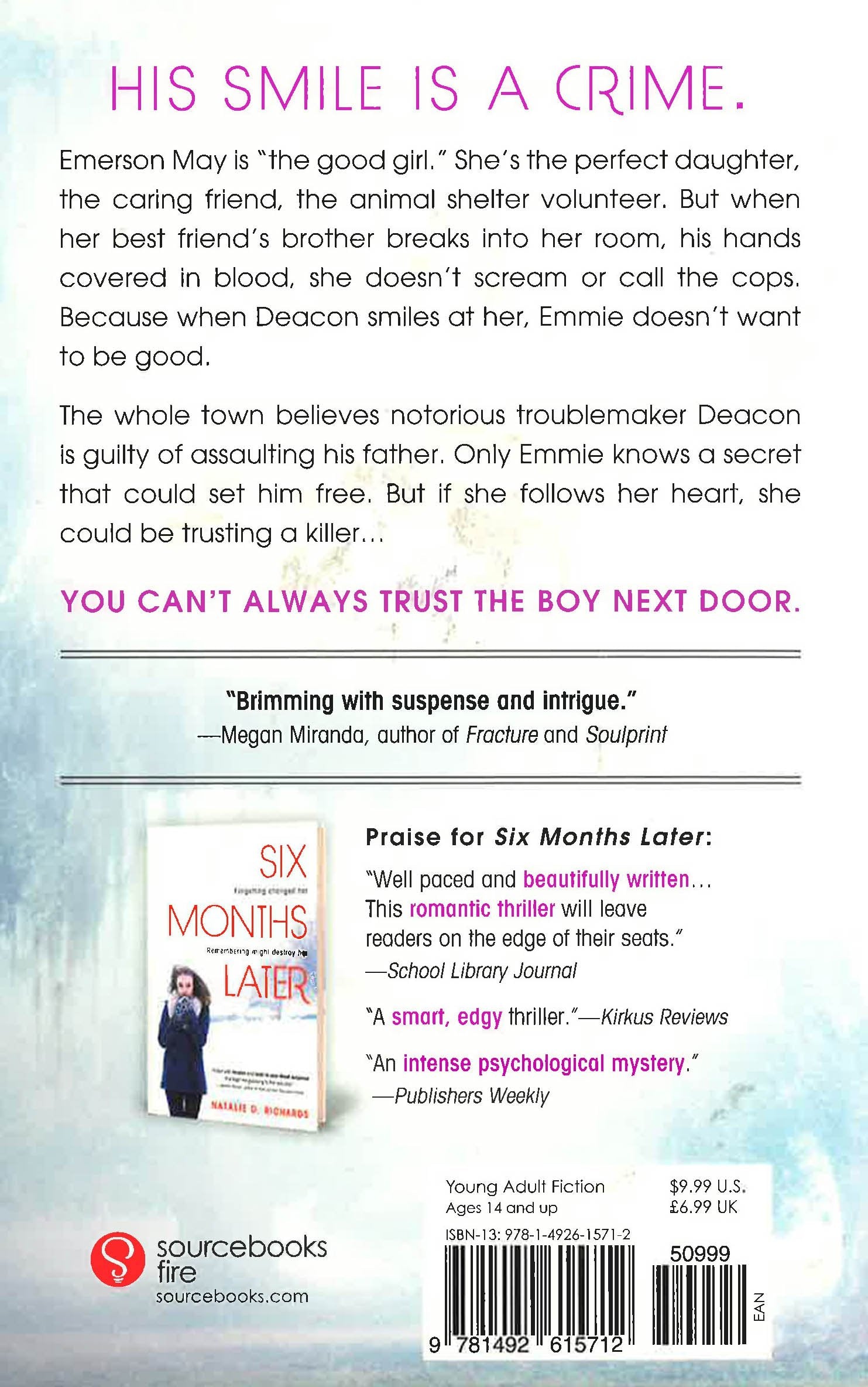 From the author of Six Months Later! There was blood on his hands. Why wasn't there guilt in his eyes? Emerson May is"the good girl." She's the perfect daughter, the caring friend, the animal shelter volunteer. But when her best friend's brother breaks into her room, his hands covered in blood, she doesn't scream or call the cops. Because when Deacon smiles at her, Emmie doesn't want to be good... The whole town believes notorious troublemaker Deacon is guilty of assaulting his father. Only Emmie knows a secret that could set him free. But if she follows her heart, she could be trusting a killer...