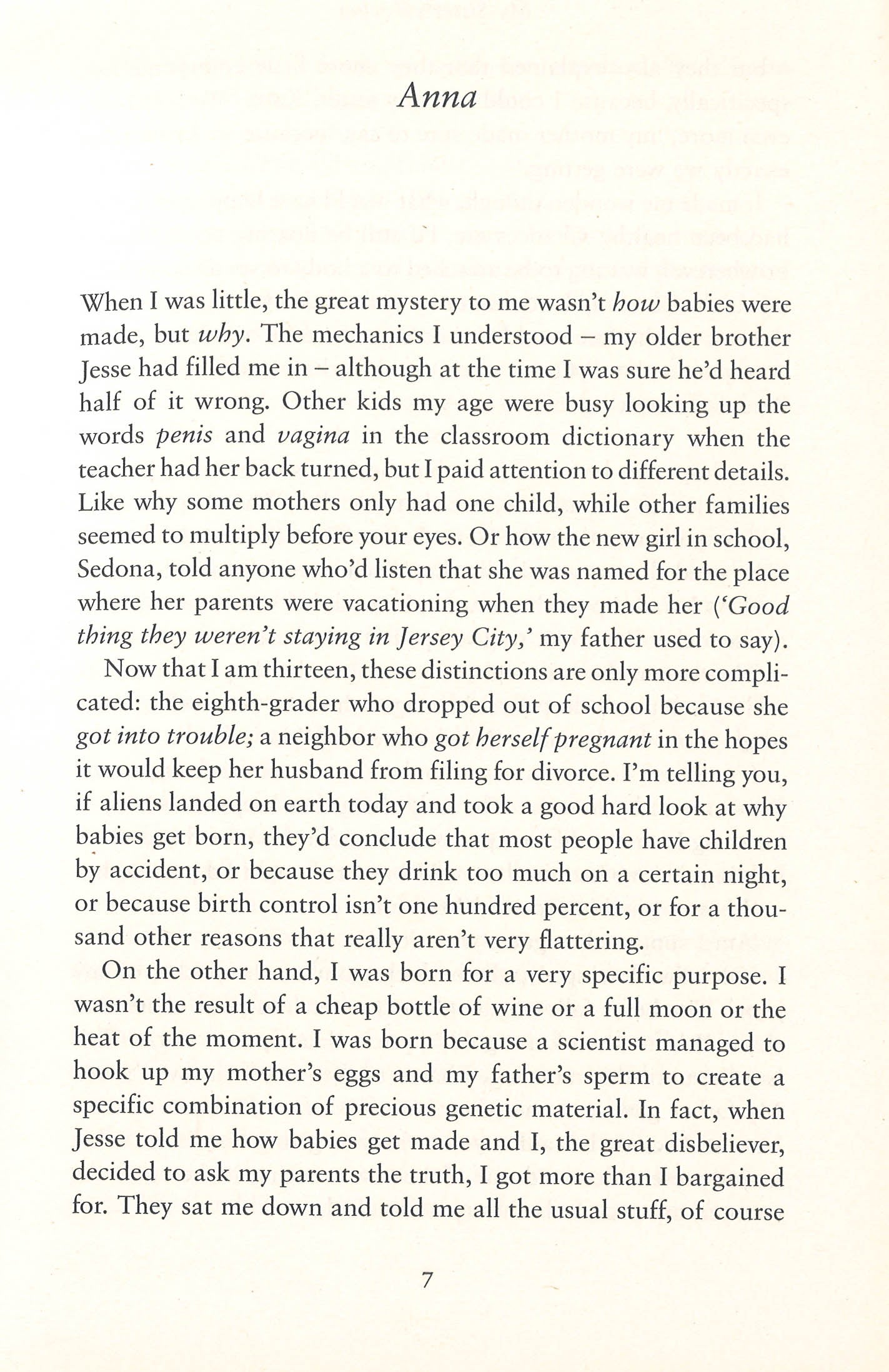 Anna is not sick, but she might as well be. By age thirteen, she has undergone countless surgeries, transfusions, and shots so that her older sister, Kate, can somehow fight the leukemia that has plagued her since childhood. The product of preimplantation genetic diagnosis, Anna was conceived as a bone marrow match for Kate -- a life and a role that she has never challenged...until now. Like most teenagers, Anna is beginning to question who she truly is. But unlike most teenagers, she has always been defined in terms of her sister -- and so Anna makes a decision that for most would be unthinkable, a decision that will tear her family apart and have perhaps fatal consequences for the sister she loves. My Sister's Keeper examines what it means to be a good parent, a good sister, a good person. Is it morally correct to do whatever it takes to save a child's life, even if that means infringing upon the rights of another? Is it worth trying to discover who you really are, if that quest makes you like yourself less? Should you follow your own heart, or let others lead you?