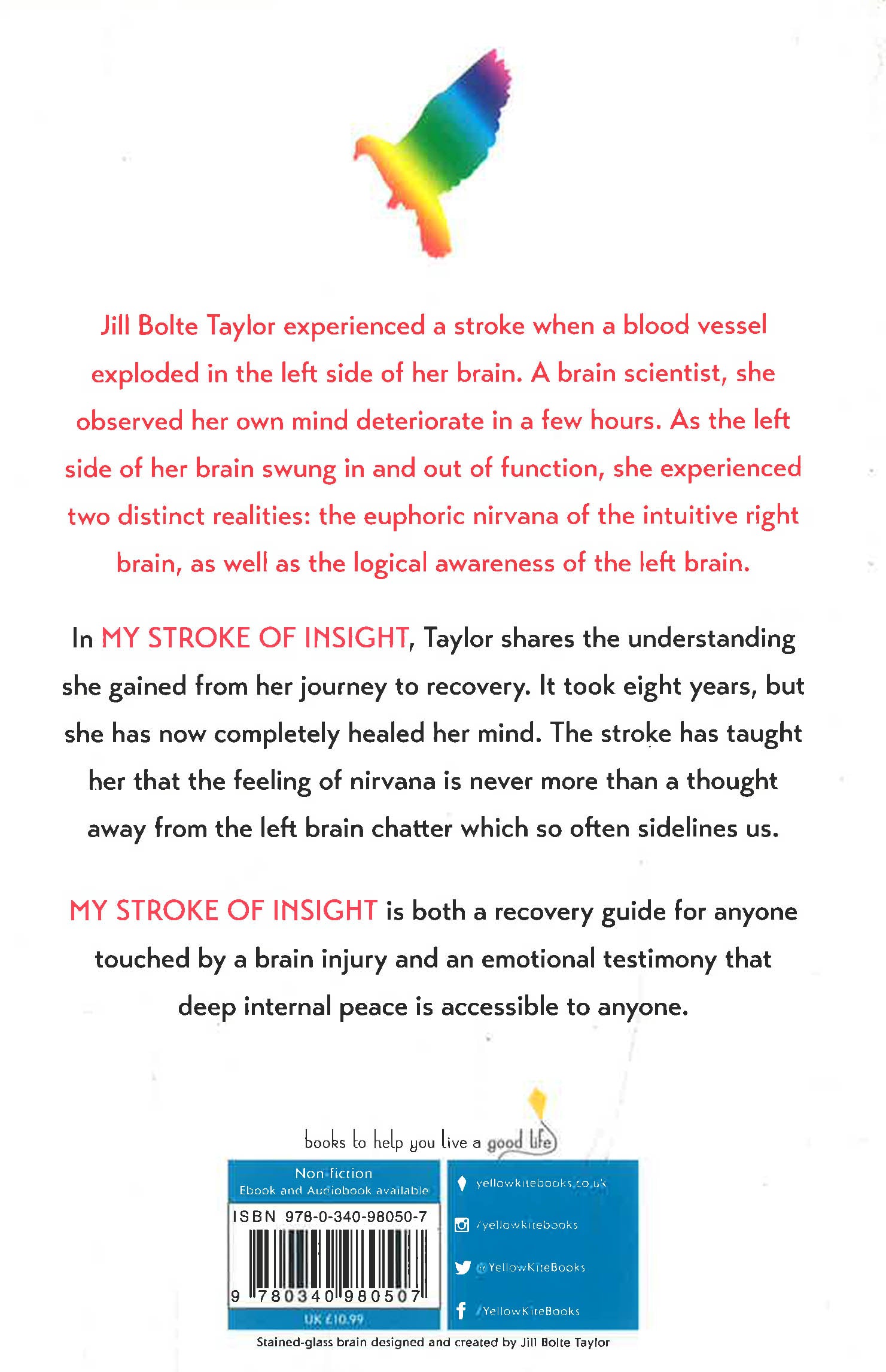 A neuroanatomist by profession, she observed her own mind completely deteriorate to the point that she lost the ability to walk, talk, read, write, or recall any of her life, all within the space of four hours. As the damaged left side of her brain - the rational, logical, detail and time-oriented side - swung in an out of function, Taylor alternated between two distinct and opposite realities: the euphoric Nirvana of the intuitive and emotional right brain, in which she felt a sense of complete well-being and peace; and the logical left brain, that realized Jill was having a stroke and enabled her to seek help before she was lost completely.