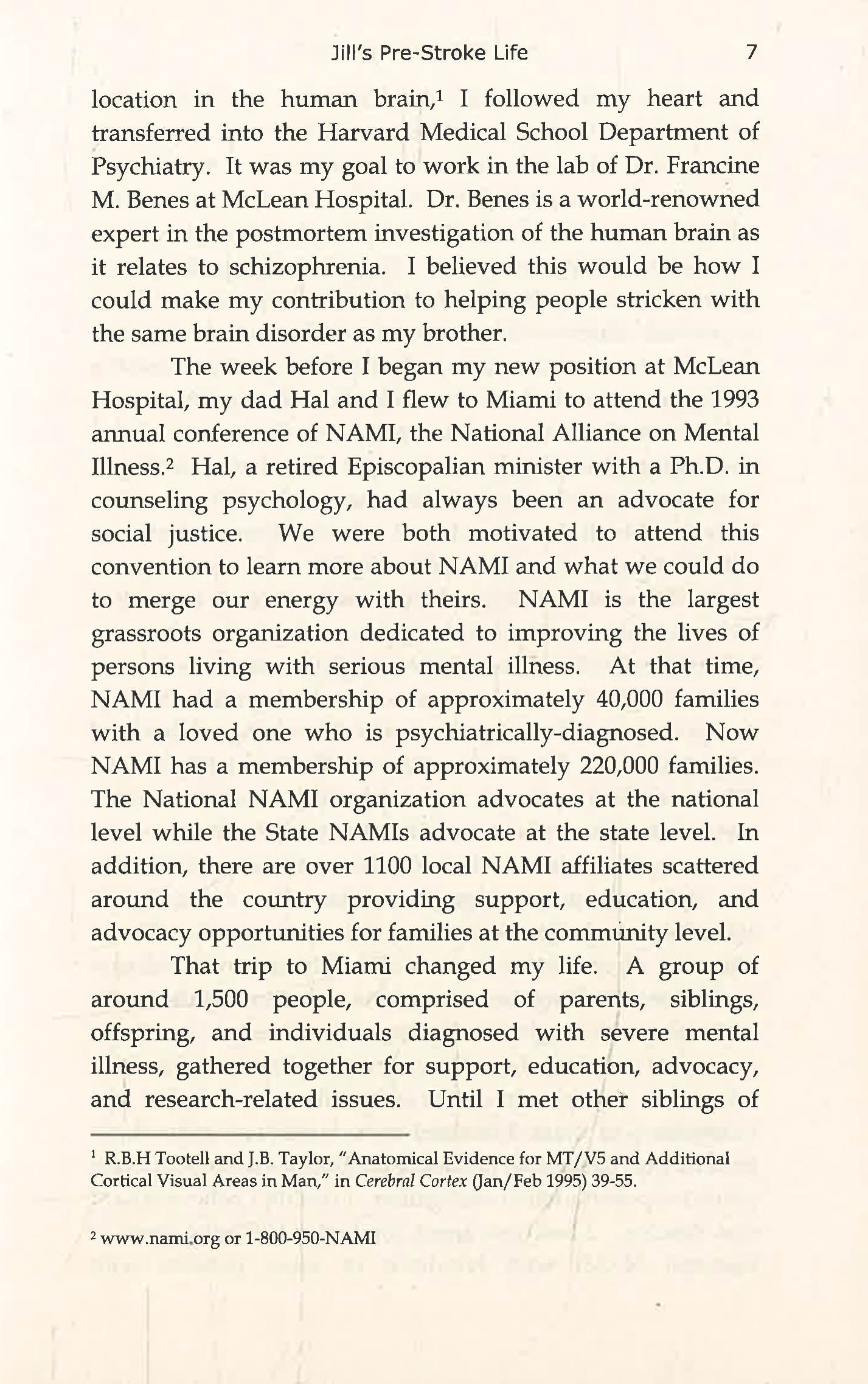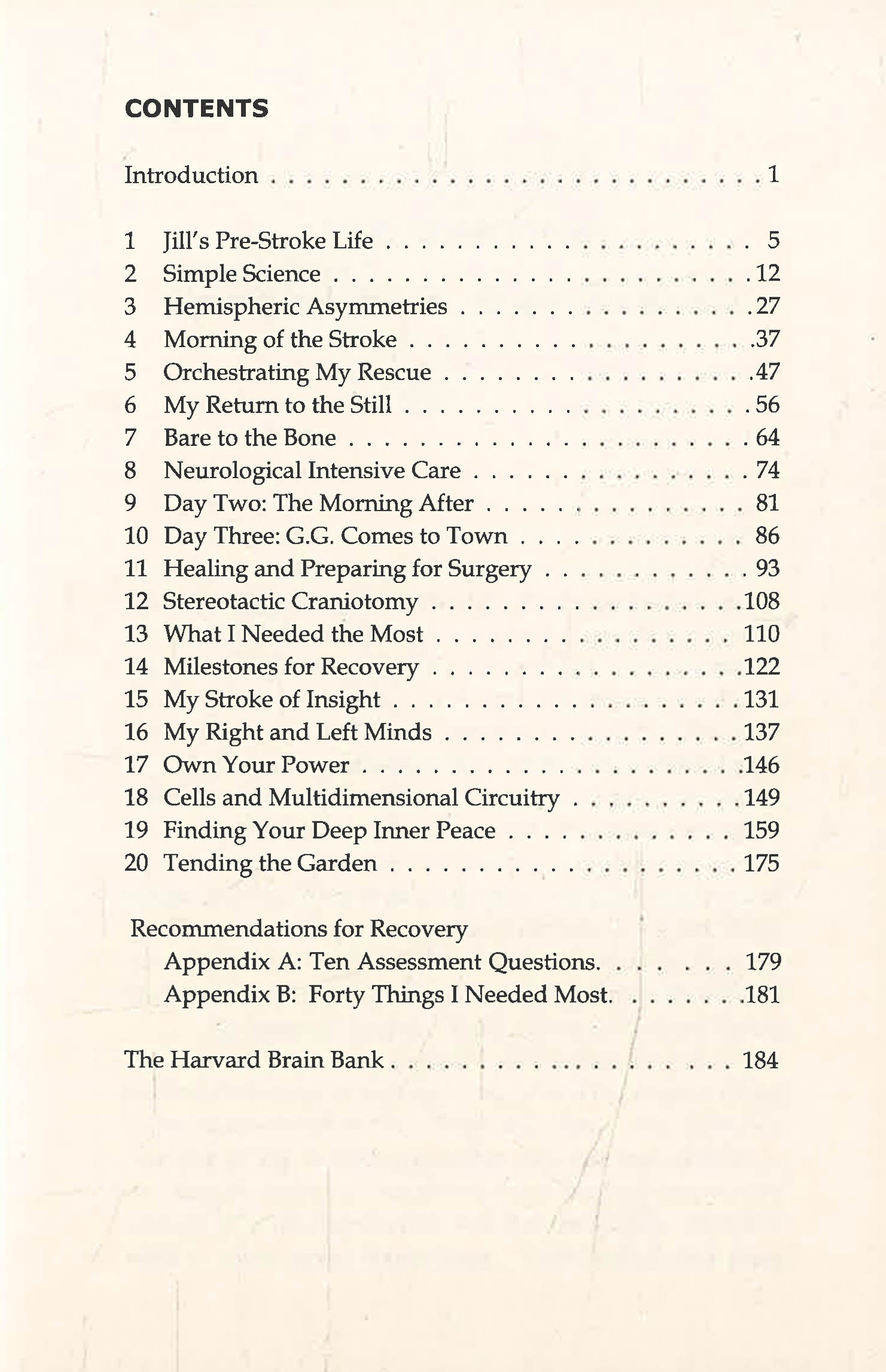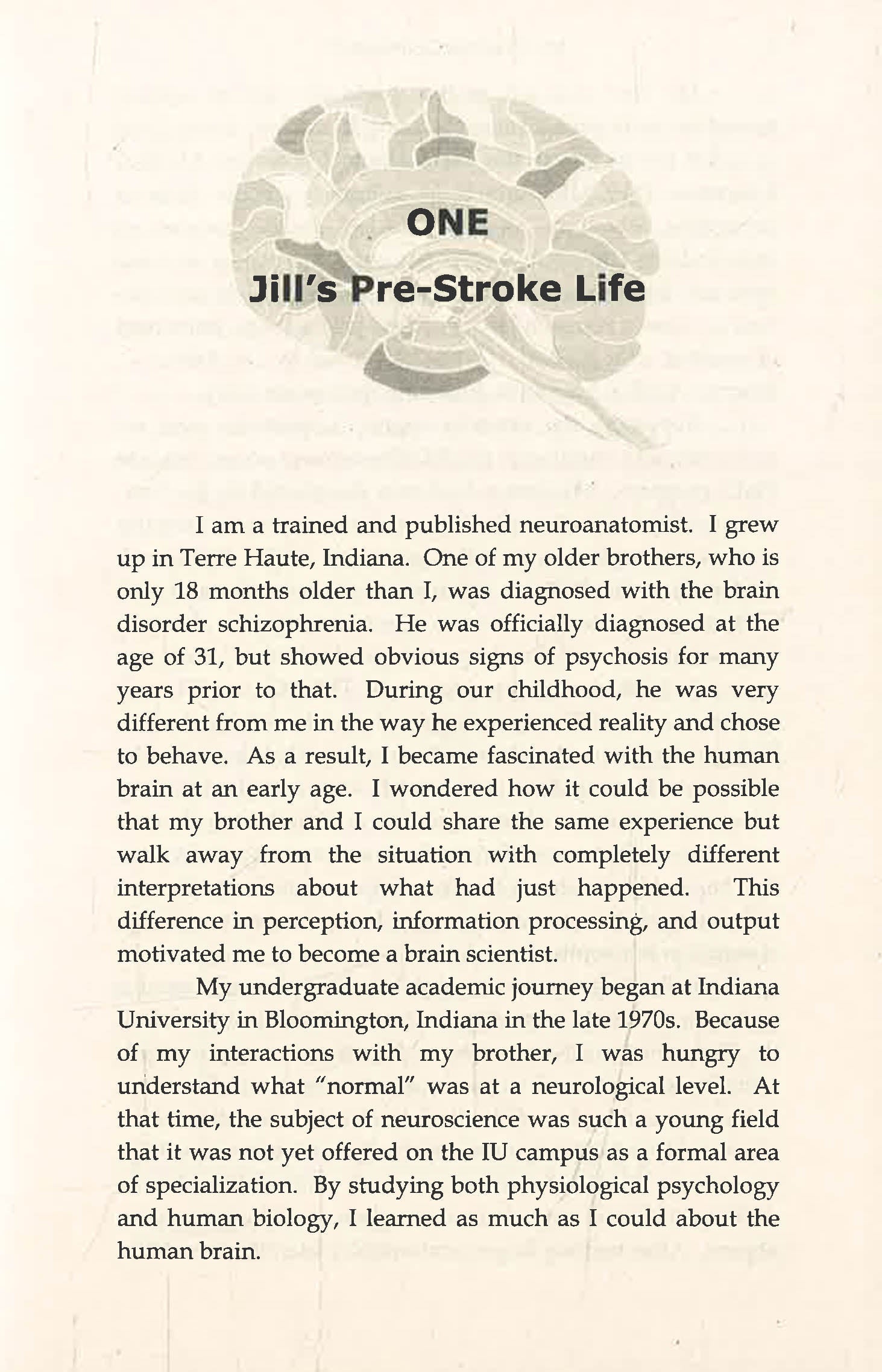In My Stroke of Insight: A Brain Scientist's Personal Journey, Taylor brings to light a new perspective on the brain and its capacity for recovery that she gained through the intimate experience of awakening her own injured mind. The journey to recovery took eight years for Jill to feel completely healed. Using her knowledge of how the brain works, her respect for the cells composing her human form, and an amazing mother, Taylor completely repaired her mind and recalibrated her understanding of the world according to the insight gained from her right brain that December morning.