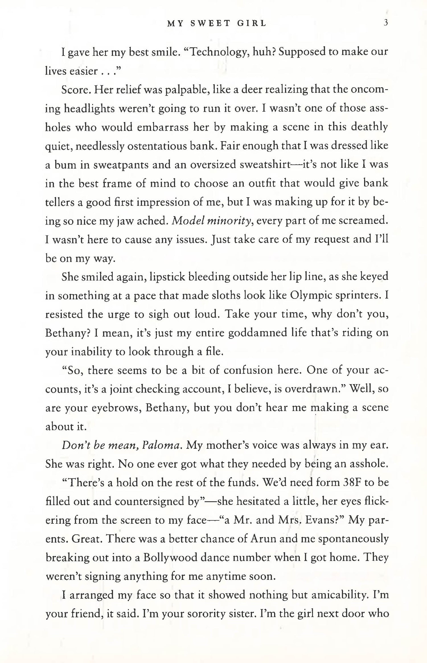 Now at thirty years old and recently cut off from her parents’ funds, she decides to sublet the second bedroom of her overpriced San Francisco apartment to Arun, who recently moved from India. Paloma has to admit, it feels good helping someone find their way in America—that is until Arun discovers Paloma's darkest secret, one that could jeopardize her own fragile place in this country.
