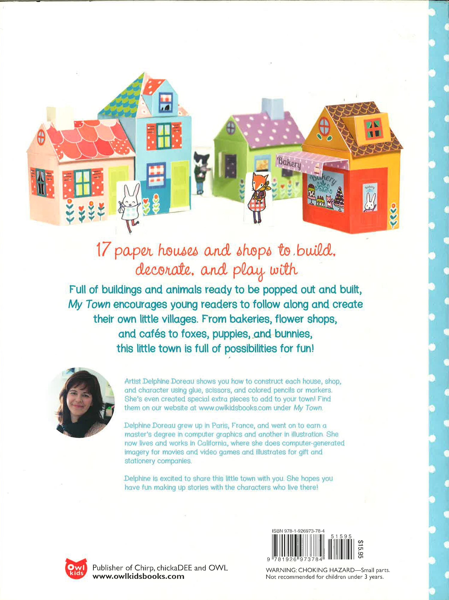 My Town" contains a mini-community for readers to build -- bringing new meaning to the term "pop-up store!" Unlike typical "paper doll" books that focus on fashion, "My Town" is full of perforated buildings and animals ready to be popped out, decorated, and played with by children. Buildings range from various styles of houses to all kinds of boutique storefronts. Set up shop as a baker, a florist, a grocer, a bookseller, or an auto mechanic -- there's a store to match every reader's special interest. Dozens of animal characters can be added to the scene and some can be colored in, too. A sturdy fold-out map at the back of the book gives readers a place to arrange their community. Plus, "My Town" creator Delphine Doreau has prepared a number of free downloads for readers to print, color, and use to expand their towns (address included in book). Instructions are warm and simple and read more like a story than like step-by-step directions, so children will be engaged in reading while they craft. And once completed, the miniature village will complement playtime with beloved toys perfectly -- add cars, stuffed animals, and more!