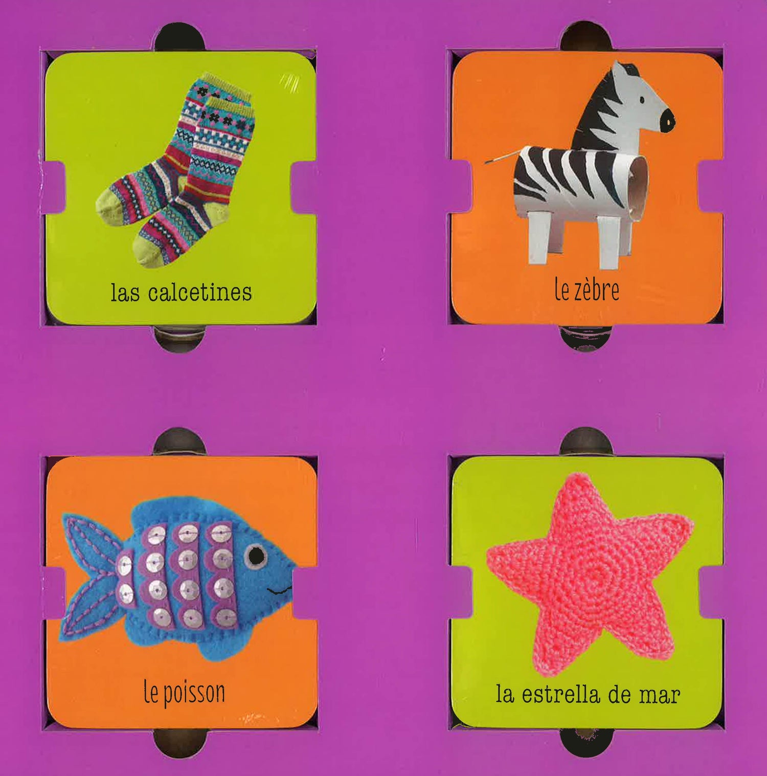 An illustrated book of 100 first words in English, French and Spanish, including 100 double-sided flash cards.
