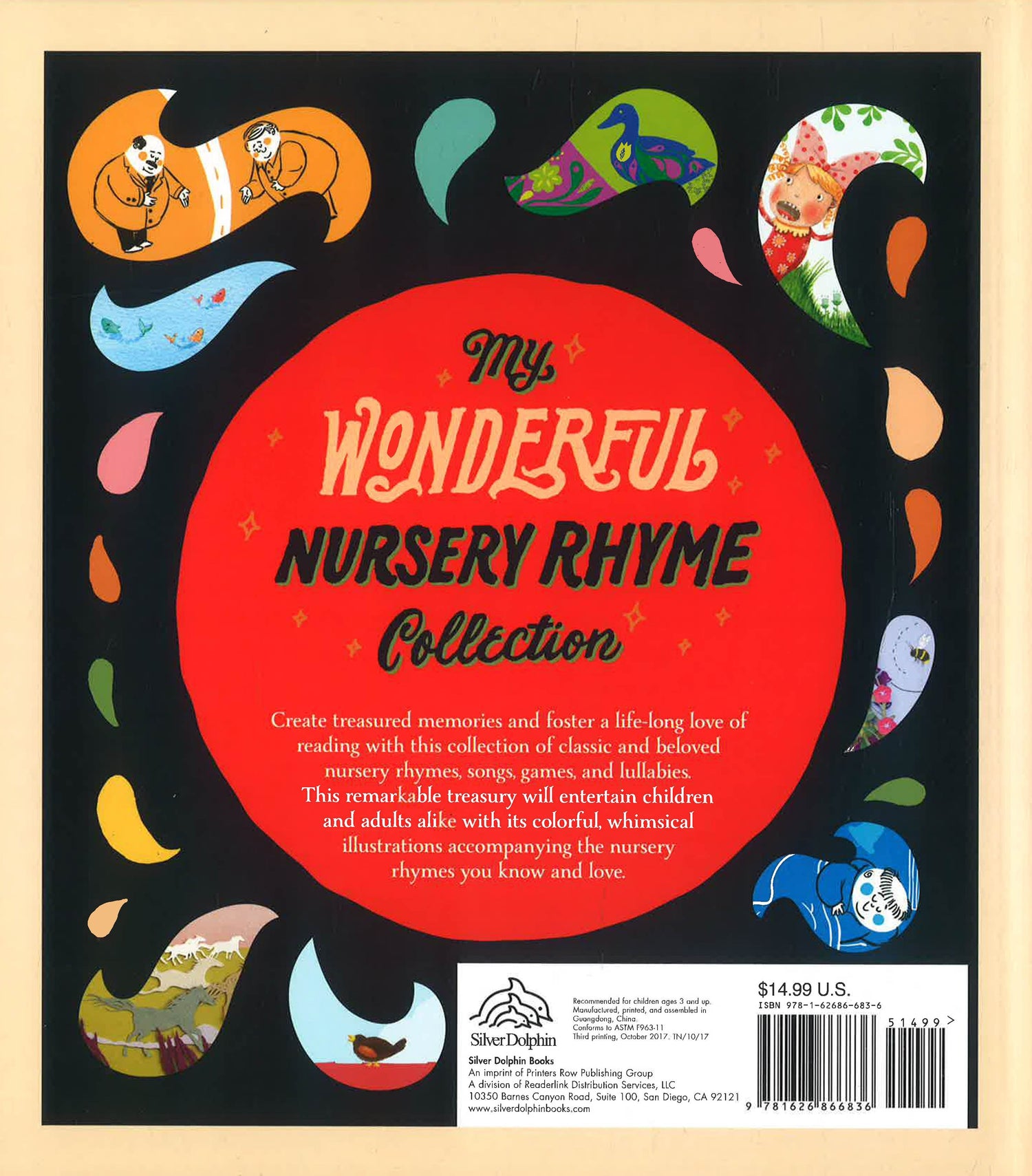 This stunning collection of nursery rhymes features all of the favorites, each illustrated by a different artist. My Wonderful Nursery Rhyme Collection is the perfect gift for baby showers or birthdays. It includes a die-cut cover, ribbon bookmark, and 192-pages of classic rhymes paired with modern illustration. This nursery rhyme collection is sure to be a collectible passed through the generations.