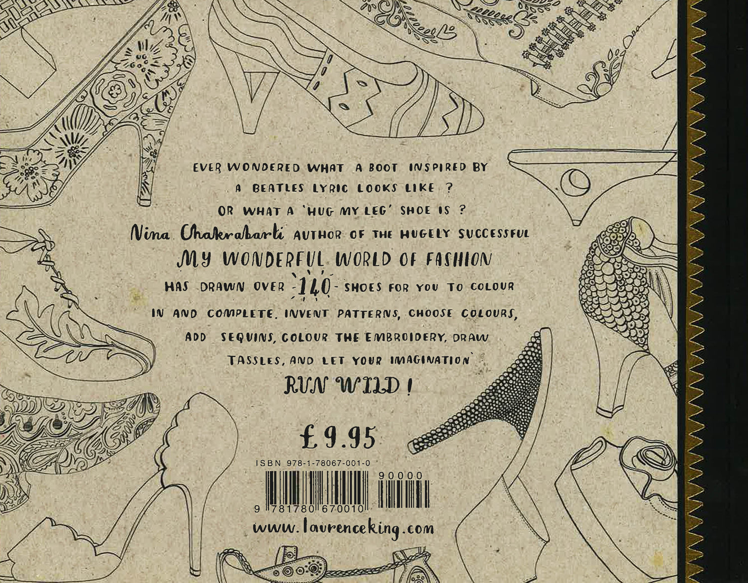 Ever wondered what a boot inspired by a `Beatles` lyric looks like? What is a 'Hug My Leg' shoe? And how about lace-ups inspired by 18th-century snuff boxes? This title features over 140 beautifully drawn shoes on which to add sequins, colour embroidery, draw tassles, invent patterns, craft buttons, choose colours to fill in polka dots, and stick glitter to diamond-encrusted heels. Colour in shoe decorations including the African savannah, peacocks, a taxi and even the New York skyline! Let your imagination run wild. From stilettos to loafers, wedges to jelly shoes, platforms to sandals, Nina Chakrabarti once again dazzles us with her creative flair and inspires us to look at footwear with fresh eyes. Vintage favourites are shown alongside Vietnamese slippers, Romany boots and Louis heels, with famous designer pieces such as Vivienne Westwood's Rocking Horse golf shoe, Maison Martin Margiela's split-toe Tabi boot and Camille Unglik's metallic Luna sandal.