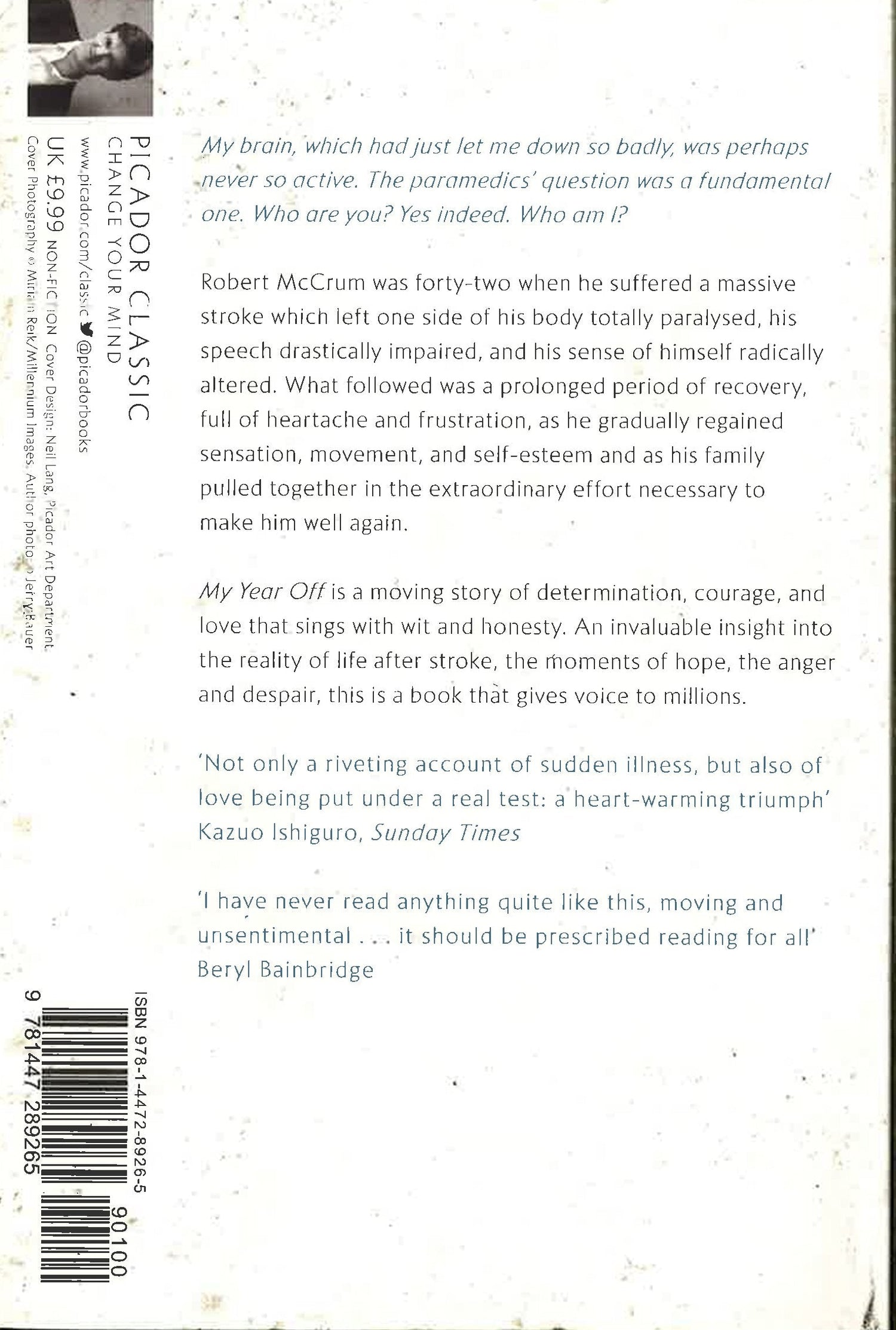 With an introduction by Henry Marsh, author of Do No HarmMy brain, which had just let me down so badly, was perhaps never so active. The paramedics' question was a fundamental one. Who are you? Yes indeed. Who am I?Robert McCrum was forty-two when he suffered a massive stroke which left one side of his body totally paralysed, his speech drastically impaired, and his sense of himself radically altered. What followed was a prolonged period of recovery, full of heart ache and frustration, as he gradually regained sensation, movement and self-esteem and as his family pulled together in the extraordinary effort necessary to make him well again. My Year Off is a moving story of determination, courage and love that sings with wit and honesty. An invaluable insight into the reality of life after stroke, the moments of hope, the anger and despair, this is a touching classic that gives voice to millions.