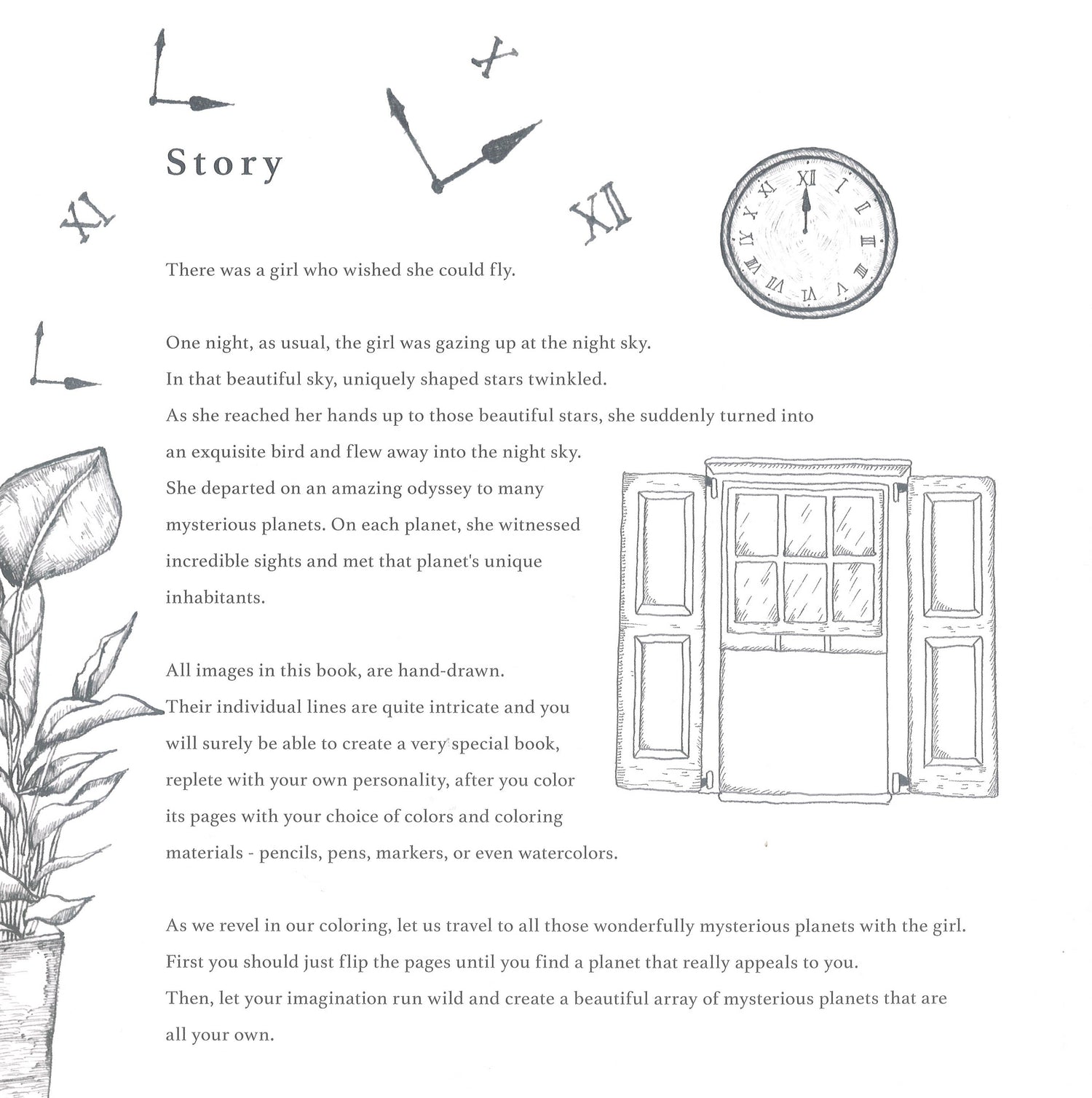 One day, while gazing at the night sky, a girl who wished she could fly suddenly turned into a beautiful bird. She flapped her wings and took off into the night sky, departing on an odyssey to many mysterious planets: a forest planet, a snowy planet, a flower-filled planet, a planet full of sweets, and a magical planet. Everywhere she goes, she meets the planet's interesting inhabitants. Get absorbed in this whimsical coloring book filled with intricate scenes by an emerging talent. Intriguing worlds exist above our heads, and now you can bring them to vibrant life with your colored pencils or markers.