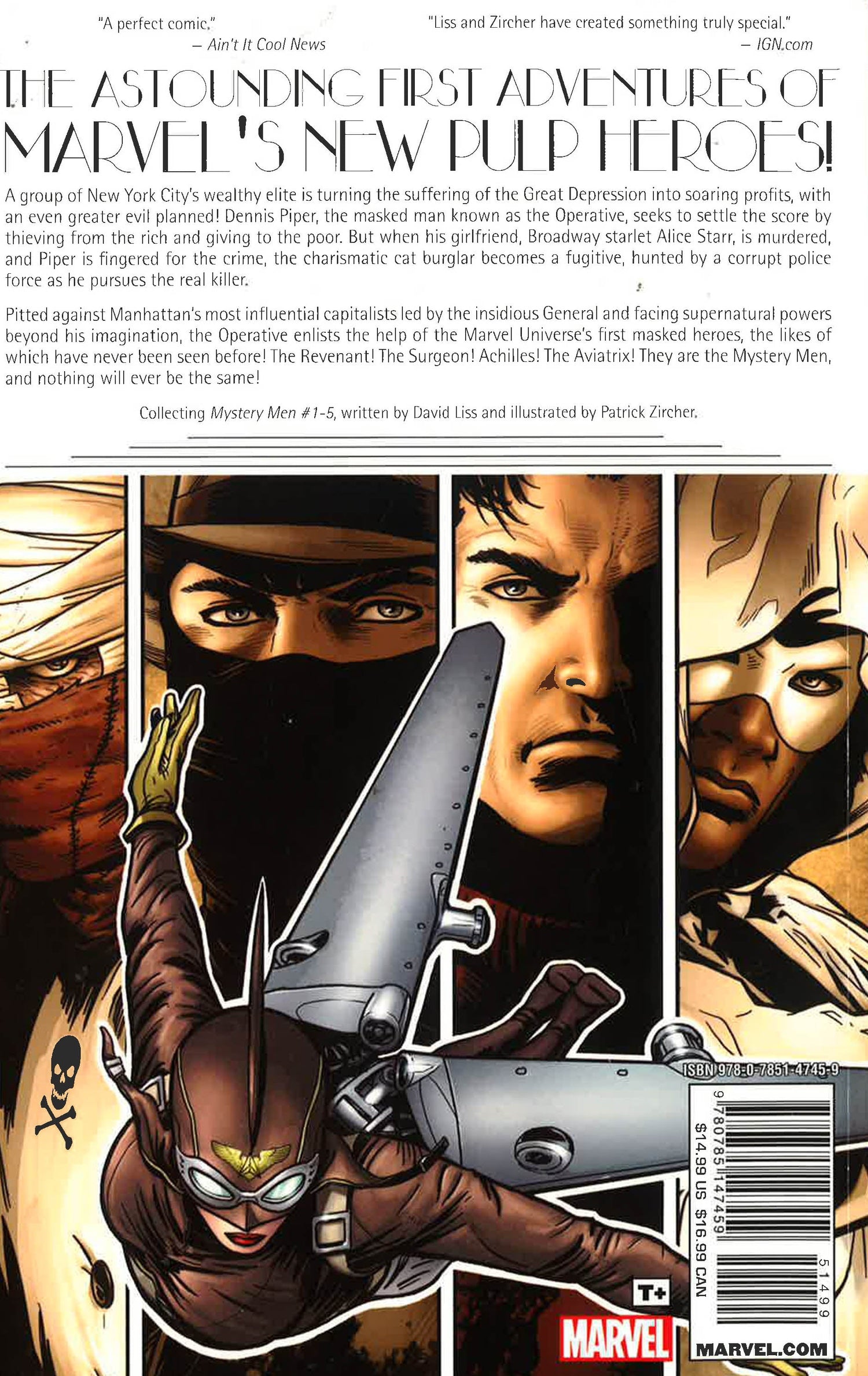 Introducing Marvel's all-new, never-before-seen heroes of the 1930s! With a new evil washing over an unsuspecting New York City, the Operative, the Aviatrix, the Surgeon, the Revenant and Achilles blast through dangers from blood-soaked mob warehouses to monster-infested mansions, and fight to blow the lid off a conspiracy that could bring the nation itself to its knees! Award-winning historical-thriller novelist David Liss (BLACK PANTHER: THE MAN WITHOUT FEAR) and acclaimed artist Patrick Zircher (SPIDERMAN NOIR) weave an edge-of-your-seat and in-continuity adventure intertwined with America's most scandalous crimes! COLLECTING: MYSTERY MEN 1-5