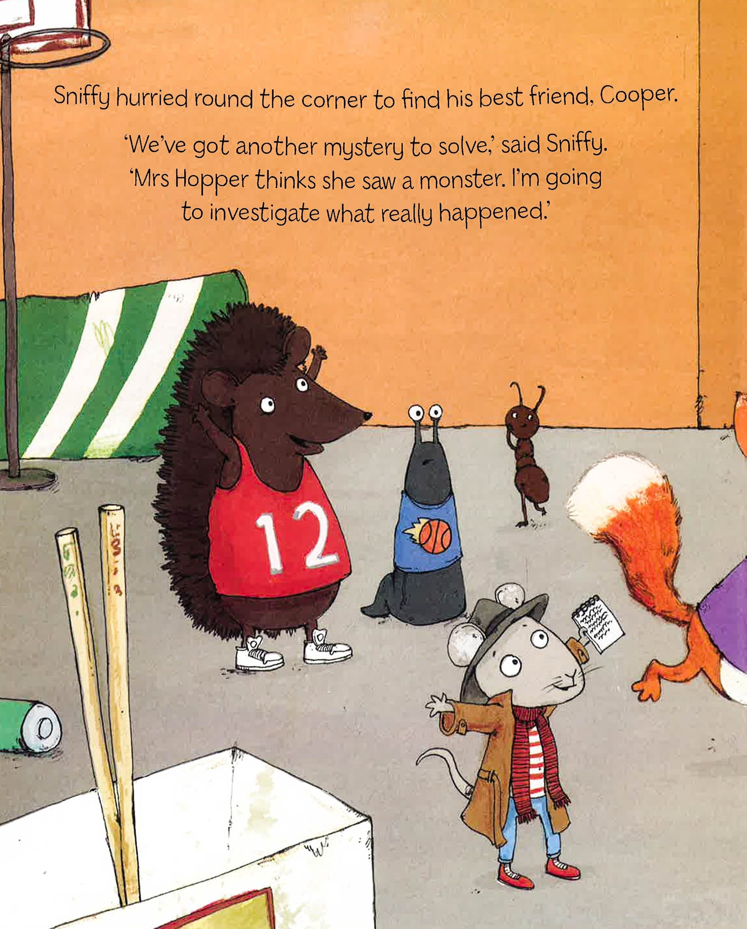 So when Mrs Hopper sees a monster in her kitchen one night, she knows just who to call for help. Sniffy doesn't believe in monsters, but his best friend Cooper the Pigeon isn't so sure, especially after Mrs Hopper describes what she saw: a hideous creature with thick green fur, huge feet and a razor-sharp horn. And as if that wasn't bad enough, the monster made a dreadful crunching sound like gigantic teeth chomping through bones.