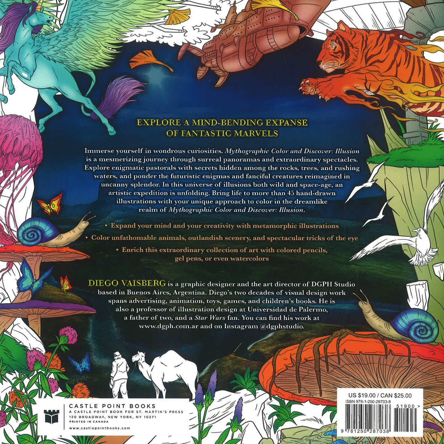 Immerse yourself in wondrous curiosities. Mythographic Color and Discover: Illusion is a mesmerizing journey through surreal panoramas and extraordinary spectacles. Explore enigmatic pastorals with secrets hidden among the rocks, trees, and rushing waters, and ponder the futuristic enigmas and fanciful creatures reimagined in uncanny splendor. In this universe of illusions both wild and space-age, an artistic expedition is unfolding. Bring life to more than 45 hand-drawn illustrations with your unique approach to color in the dreamlike realm of Mythographic Color and Discover: Illusion.