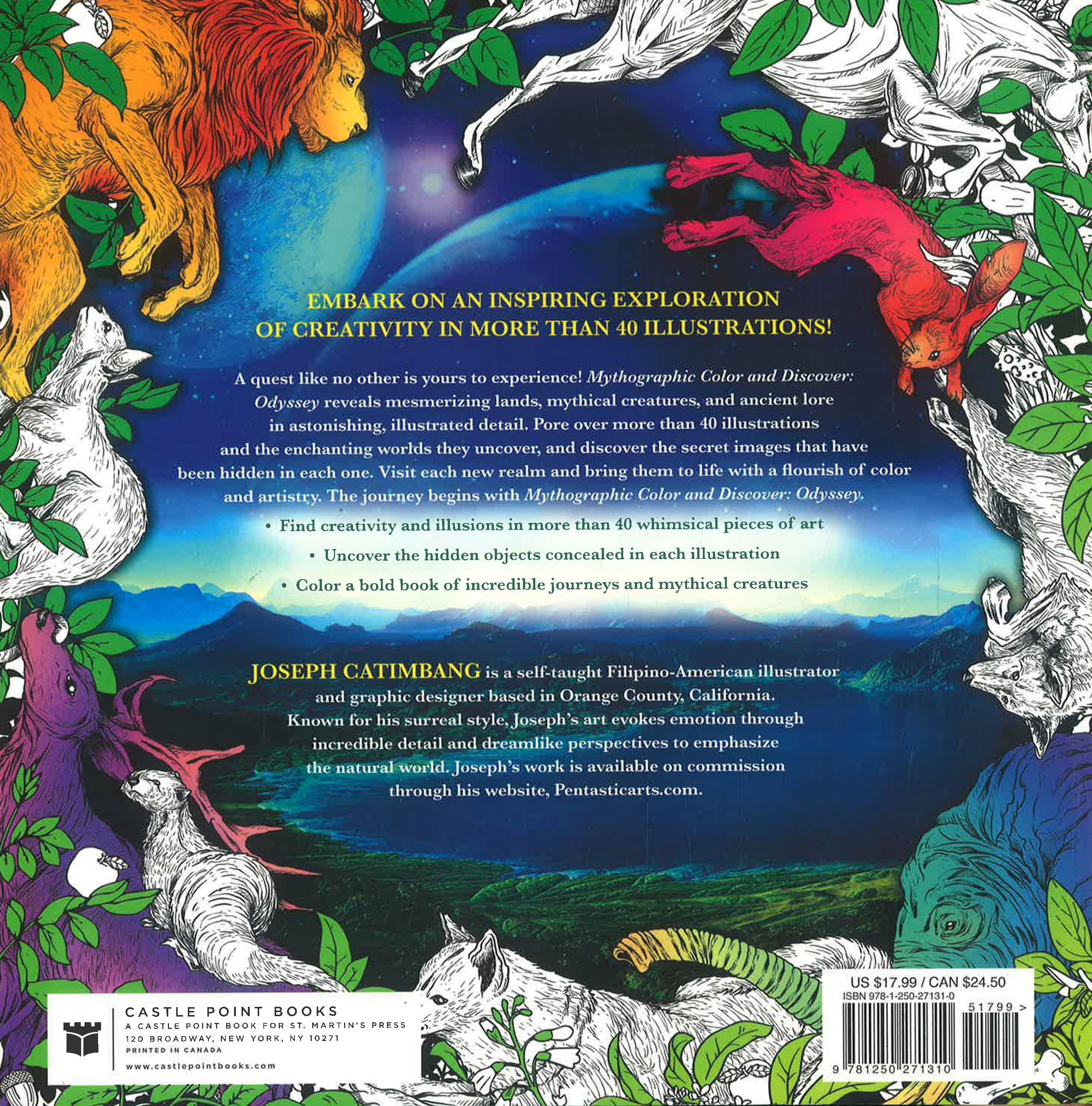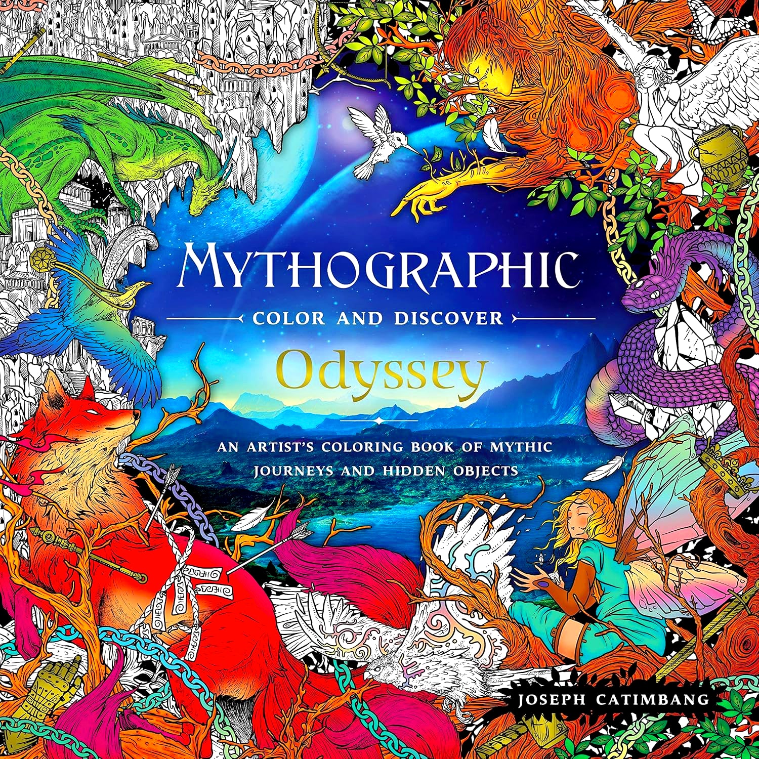 Mythographic Color and Discover: Odyssey is an amasing new collection of highly detailed illustrations to colour, complete with hidden objects to find throughout. This volume showcases ancient lore, mythical creatures, and astonishing journeys. Joseph Catimbang is back with his incredible colouring style, lush with detail and imagination.