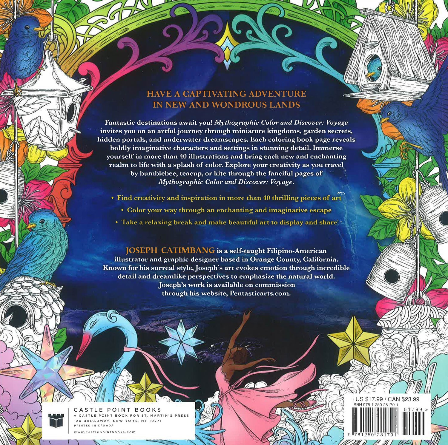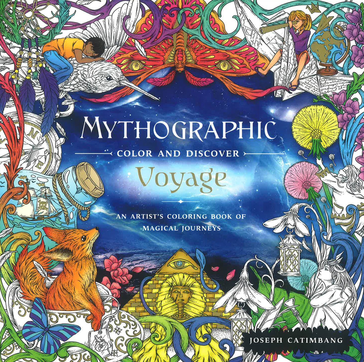 Fantastic destinations await you! Joseph Catimbang's Mythographic Color and Discover: Voyage invites you on an artful journey through miniature kingdoms, garden secrets, hidden portals, and underwater dreamscapes. Each coloring book page reveals boldly imaginative characters and settings in stunning detail. Immerse yourself in more than 40 illustrations and bring each new and enchanting realm to life with a splash of color. Explore your creativity as you travel by bumblebee, teacup, or kite through the fanciful pages of Mythographic Color and Discover: Voyage.