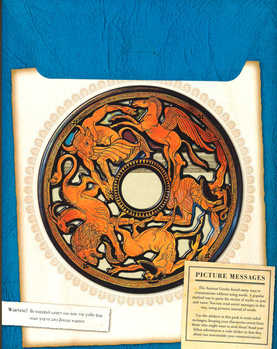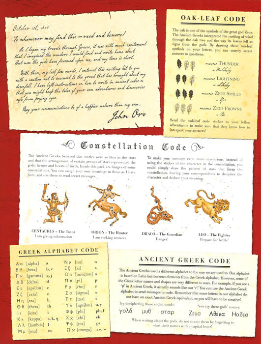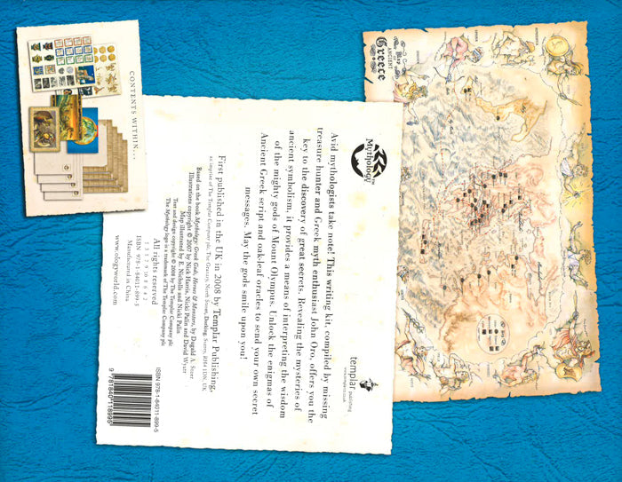 Avid mythologist take note! This writing kit, compiled by missing treasure hunter and Greek myth enthusiast John Oro, offers you the key to the discovery of great secret. Revealing the mysteries of ancient symbolism, it provides a means of interpreting the wisdom of the mighty gods of Mount Olympus. Unlock the enigmas of Ancient Greek script and oak-leaf oracles to send your own secret messages. May the gods smile upon you!