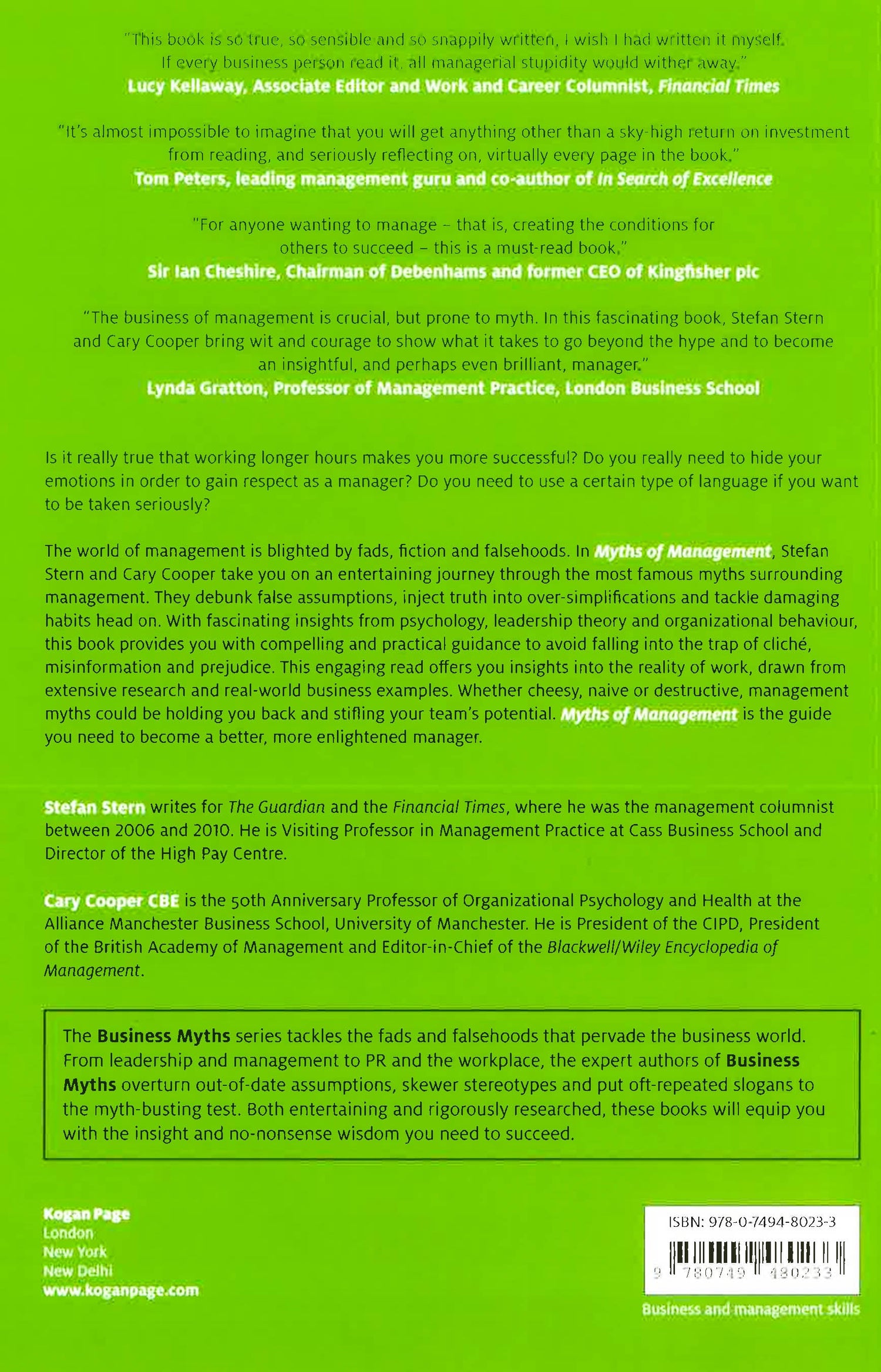 The world of management is blighted by fads, fiction and falsehoods. In Myths of Management, Cary Cooper and Stefan Stern take you on an entertaining journey through the most famous myths surrounding the much-written about topic of management. They debunk false assumptions, inject truth into over-simplifications and tackle damaging habits head-on. Fascinating insights from psychology, leadership theory and organizational behaviour provide you with a compelling and practical guide to avoid falling into the trap of cliche, misinformation and prejudice. This engaging read offers you authentic insights into the reality of work, drawn from extensive research and real-world business examples, to give you the essential knowledge you need to become a better manager.