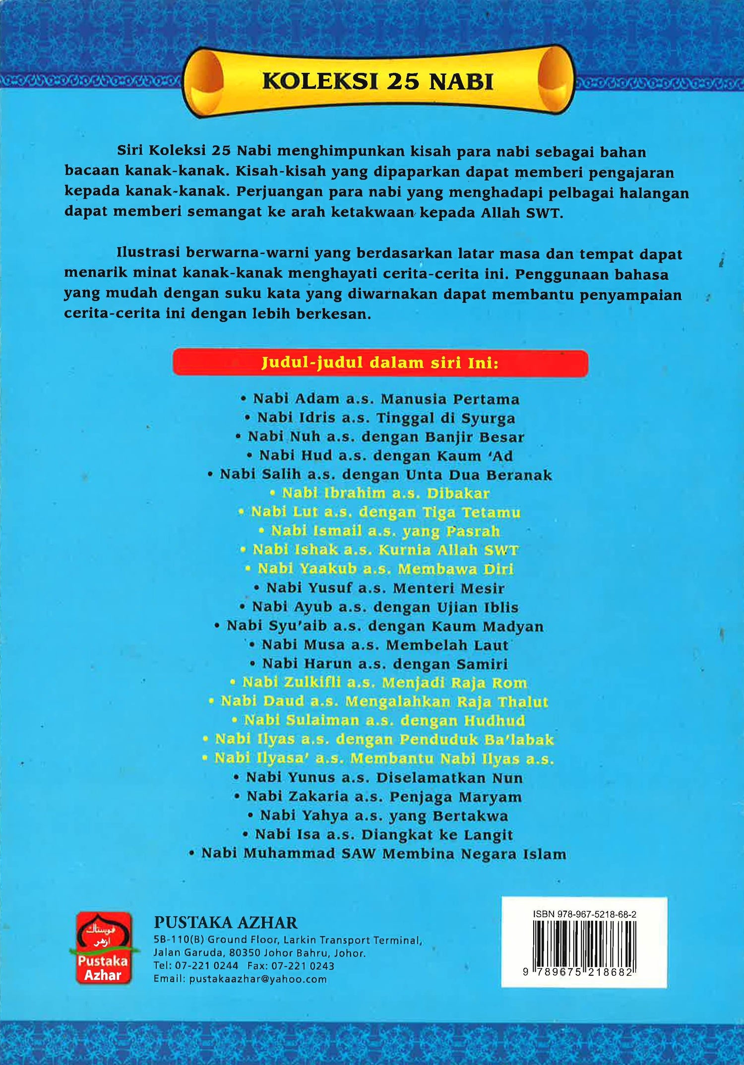 Siri Koleksi 25 Nabi menghimpunkan kisah para nabi sebagai bahan bacaan kanak-kanak. Kisah-kisah yang dipaparkan dapat memberi pengajaran kepada kanak-kanak. Perjuangan para nabi yang menghadapi pelbagai halangan dapat memberi semangat ke arah ketakwaan kepada Allah SWT. Ilustrasi berwarna-warni yang berdasarkan latar masa dan tempat dapat menarik minat kanak-kanak menghayati cerita-cerita ini. Penggunaan bahasa yang mudah dengan suku kata yang diwarnakan dapat membantu penyampaian cerita-cerita ini dengan lebih berkesan.