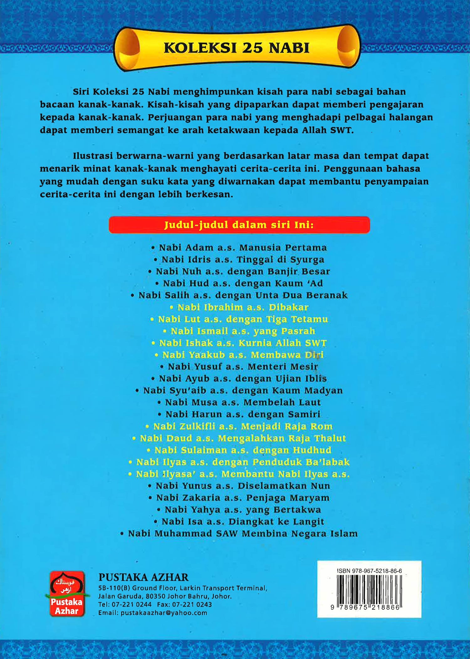 Siri Koleksi 25 Nabi menghimpunkan kisah para nabi sebagai bahan bacaan kanak-kanak. Kisah-kisah yang dipaparkan dapat memberi pengajaran emar kepada kanak-kanak. Perjuangan para nabi yang menghadapi pelbagai halangan dapat memberi semangat ke arah ketakwaan kepada Allah SWT yang mudah dengan suku kata yang diwarnakan dapat membantu penyampaian cerita-cerita ini dengan lebih berkesan.