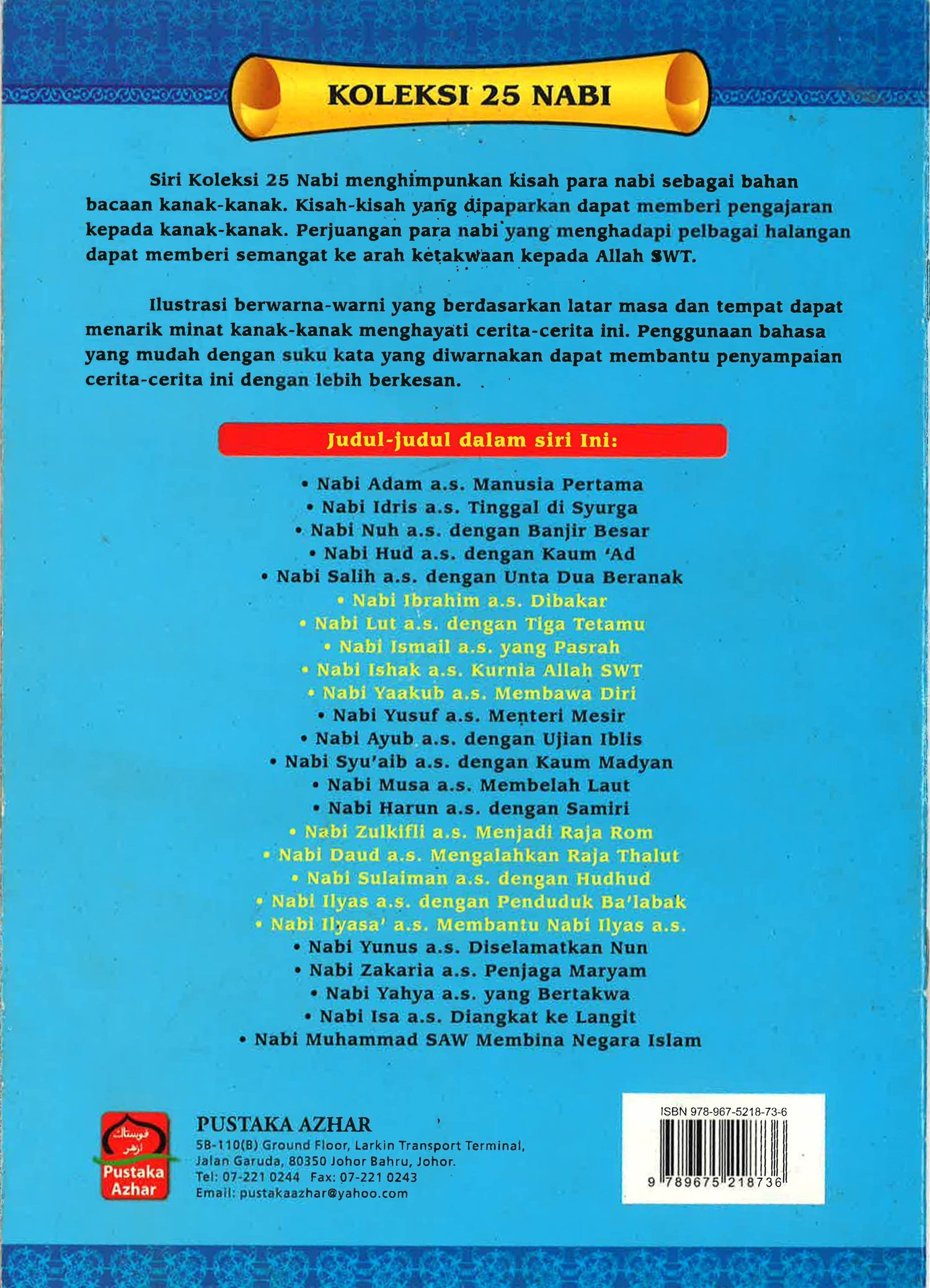 Siri Koleksi 25 Nabi menghimpunkan kisah para nabi sebagai bahan bacaan kanak-kanak. Kisah-kisah yang dipaparkan dapat memberi pengajaran kepada kanak-kanak. Perjuangan para nabi yang menghadapi pelbagai halangan dapat memberi semangat ke arah ketakwaan kepada Allah SWT. Ilustrasi berwarna-warni yang berdasarkan latar masa dan tempat dapat menarik minat kanak-kanak menghayati cerita-cerita ini. Penggunaan bahasa yang mudah dengan suku kata yang diwarnakan dapat membantu penyampaian cerita-cerita ini dengan lebih berkesan.