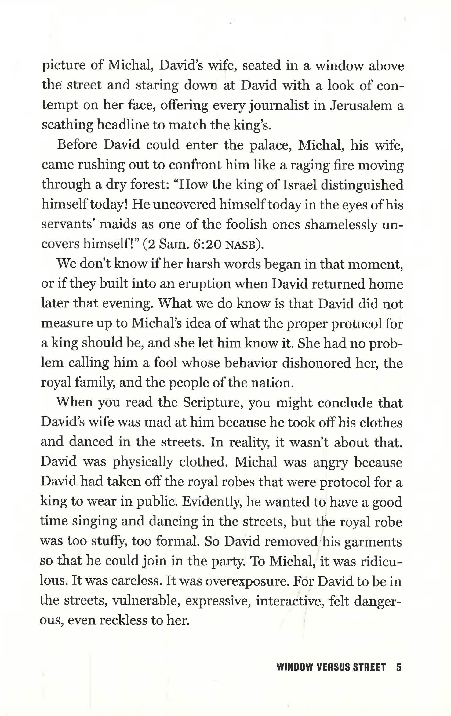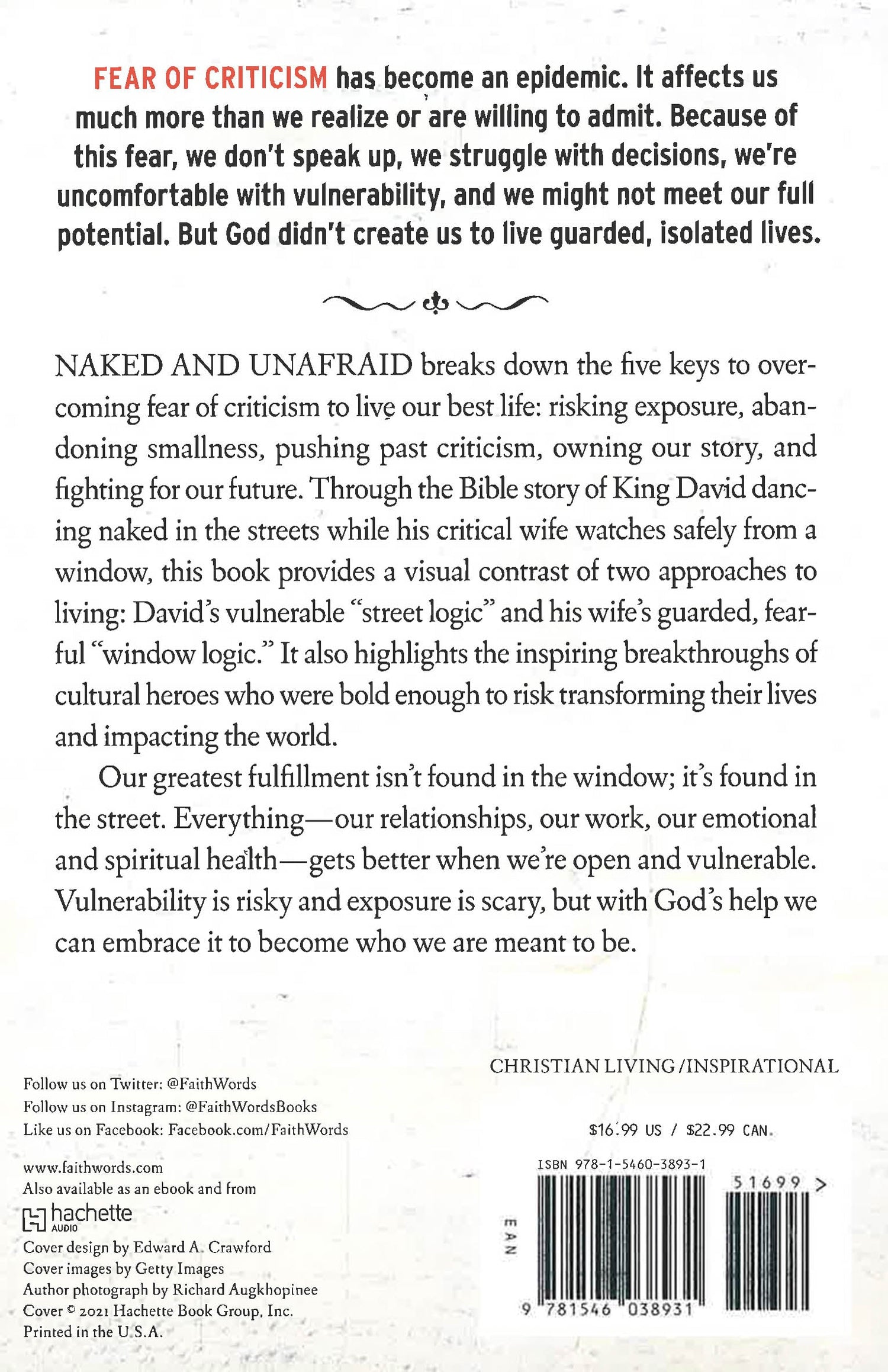 Through the Bible story of King David dancing naked in the streets while his distant, guarded, and critical wife watches from a window, Naked and Unafraid provides a visual contrast of these two characters that sheds light on the way we all approach life and explains how the fear of criticism impacts our lives much more than we realize or are willing to admit.