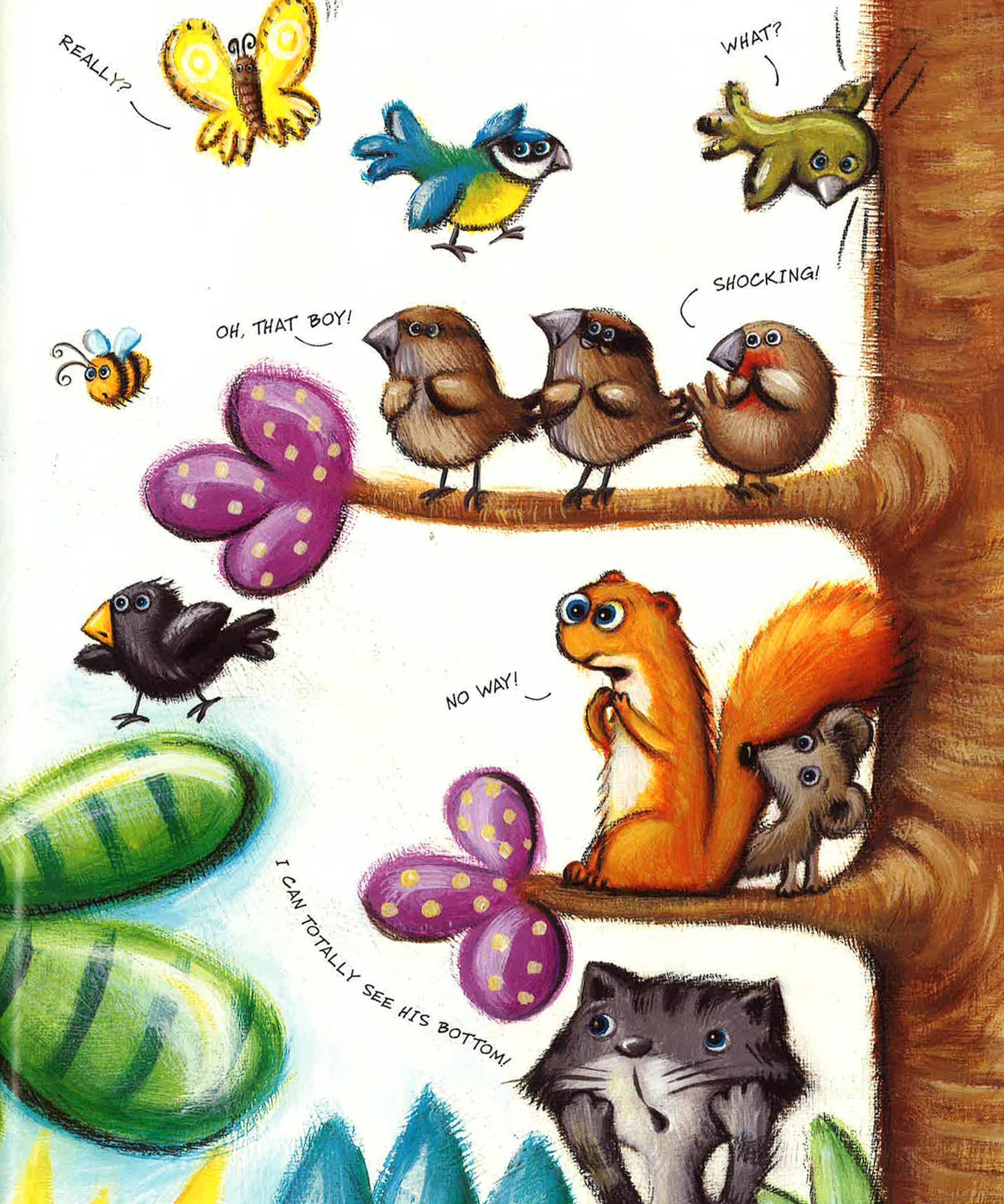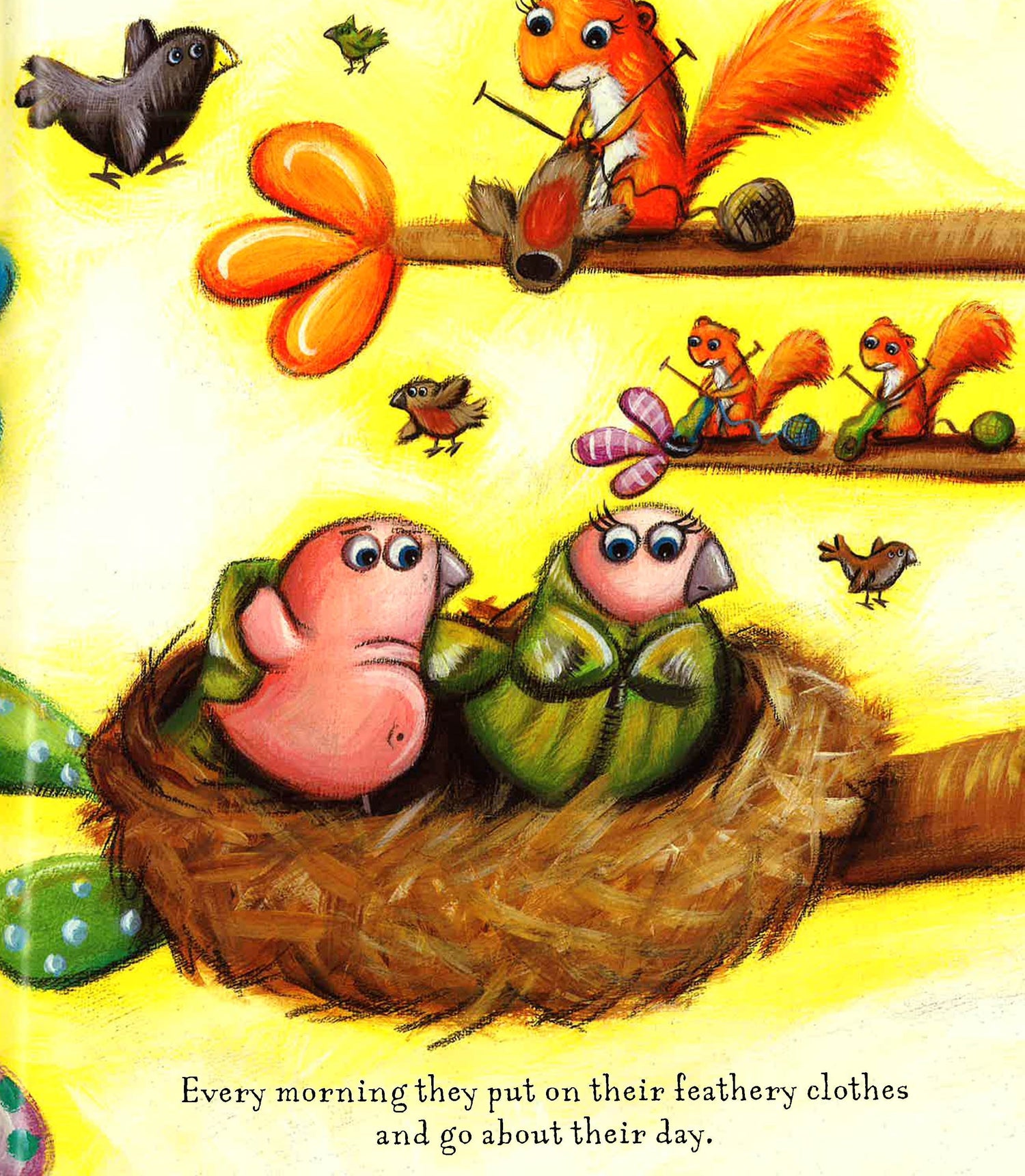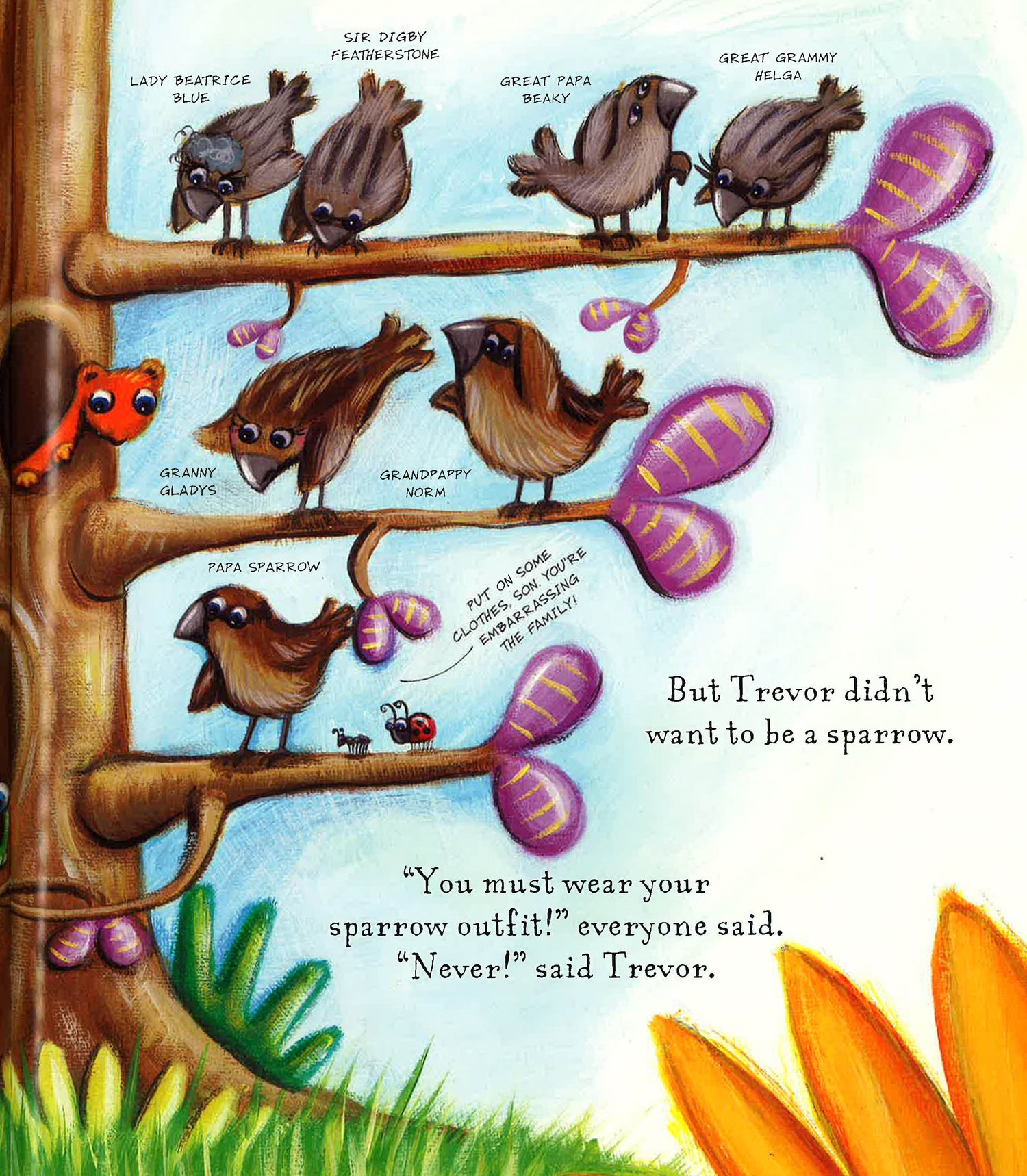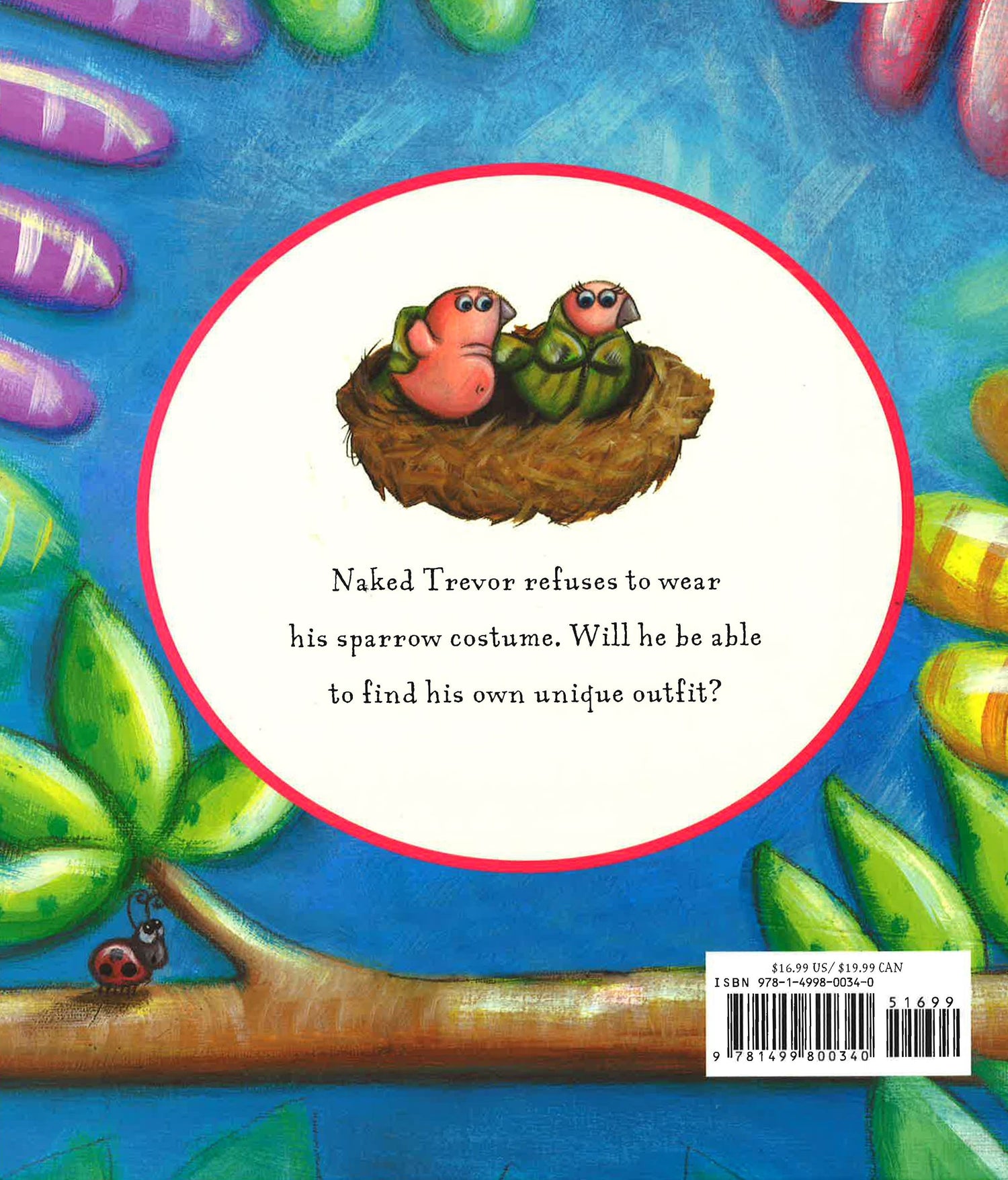It's a well-kept secret that all birds are naked, and every morning they put on their feathery clothes to go about their day. Trevor's family had always dressed as sparrows, so Trevor was expected to dress as a sparrow too. But Trevor refused to wear his sparrow costume. He wanted to find his own outfit.During his search for a unique look, Trevor crashes into a puddle of sticky mud, a pile of leaves, and a patch of colorful flowers. Giving up, Trevor decides to fly home. But when he arrives, he gets a surprising reaction from his friends and family.