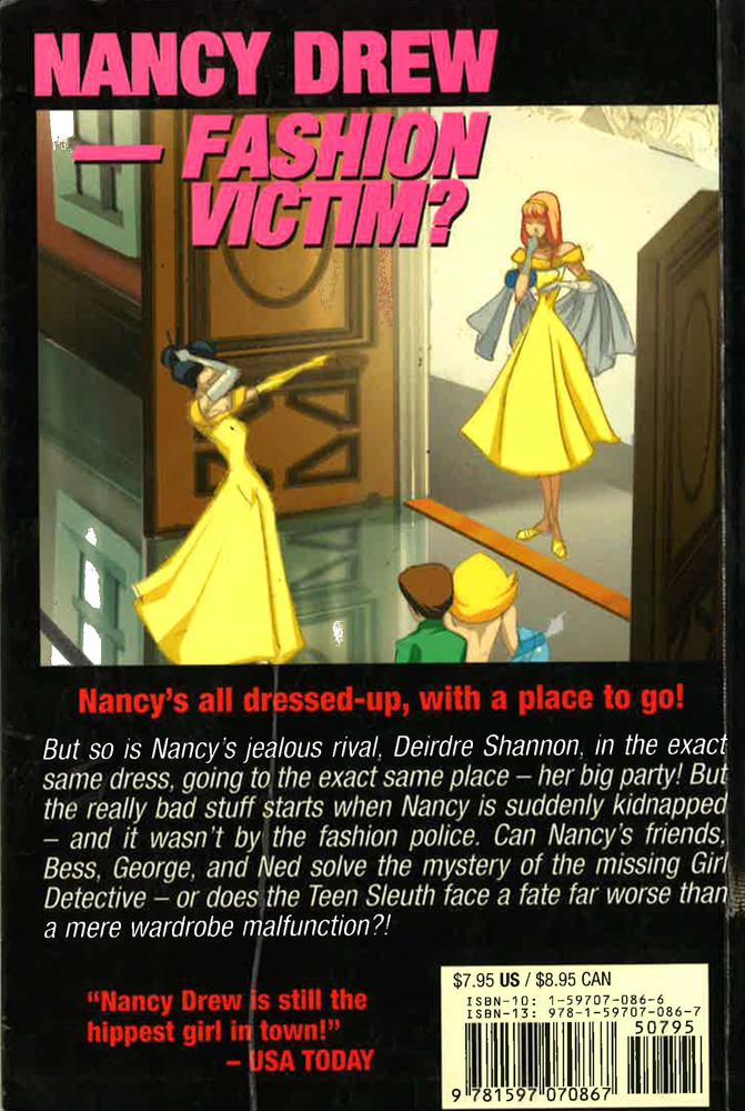 When "Bess" and "George" help "Nancy" pick out a dress for "Deirdre's" big party, little do they suspect it's the identical dress Deirdre will be wearing. After a minor altercation with the perturbed hostess, "Nancy" leaves the party only to be grabbed by a dark figure, tossed into a van and kidnapped! That leaves "Bess" and "George", with some help from "Ned", to try and solve the mystery of exactly what just happened to "Nancy". Things get complicated further when "Bess" and "George's" number one suspect, "Deirdre", is kidnapped too!