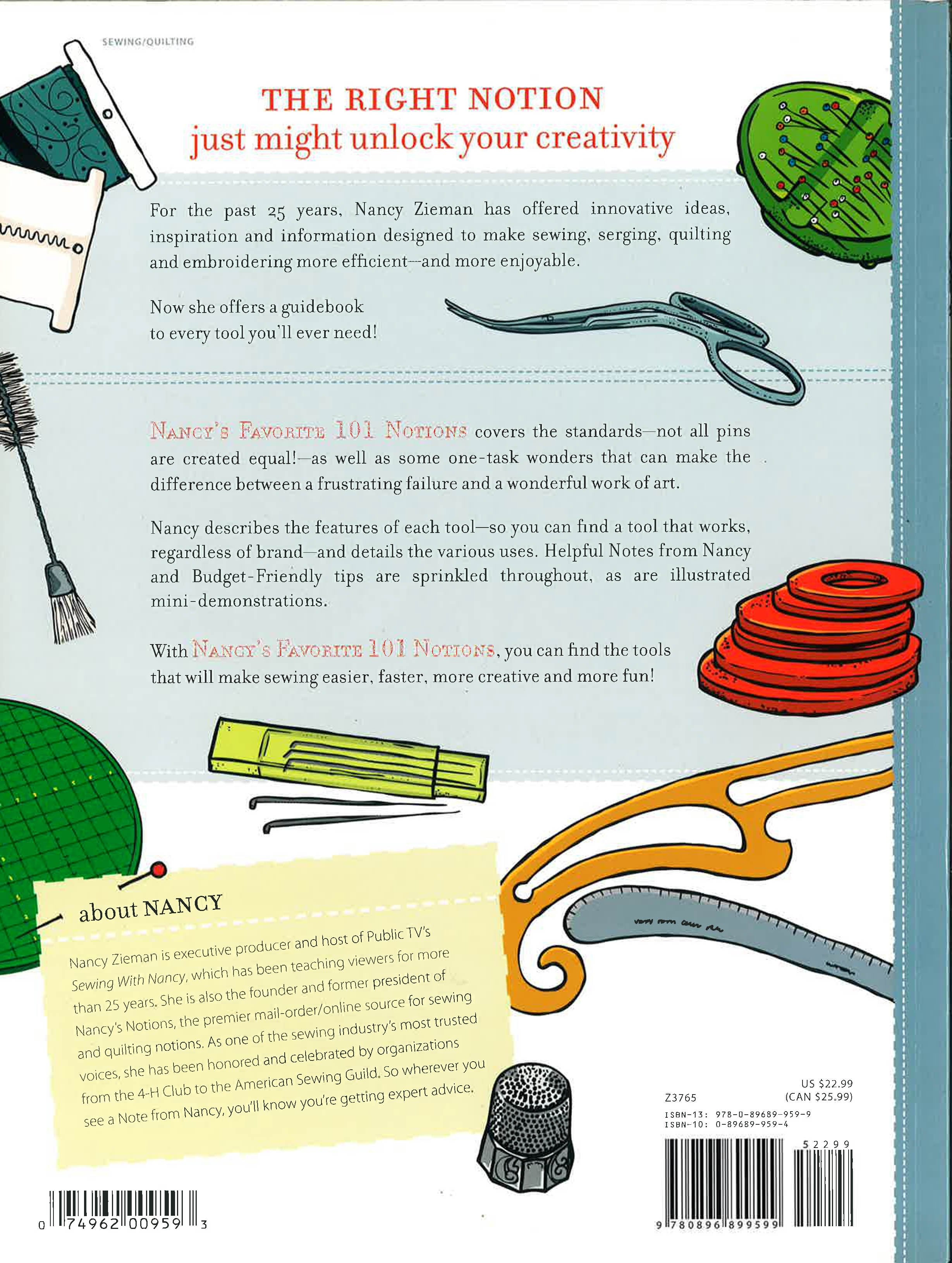 Nancy's Favorite 101 Notions covers the standards-not all pins are created equal!-as well as some one-task wonders that can make the difference between a frustrating failure and a wonderful work of art. Nancy describes the features of each tool-so you can find a tool that works, regardless of brand-and details the various uses. Helpful Notes from Nancy and Budget-Friendly tips are sprinkled throughout, as are illustrated mini-demonstrations. With Nancy's Favorite 101 Notions, you can find the tools that will make sewing easier, faster, more creative and more fun!