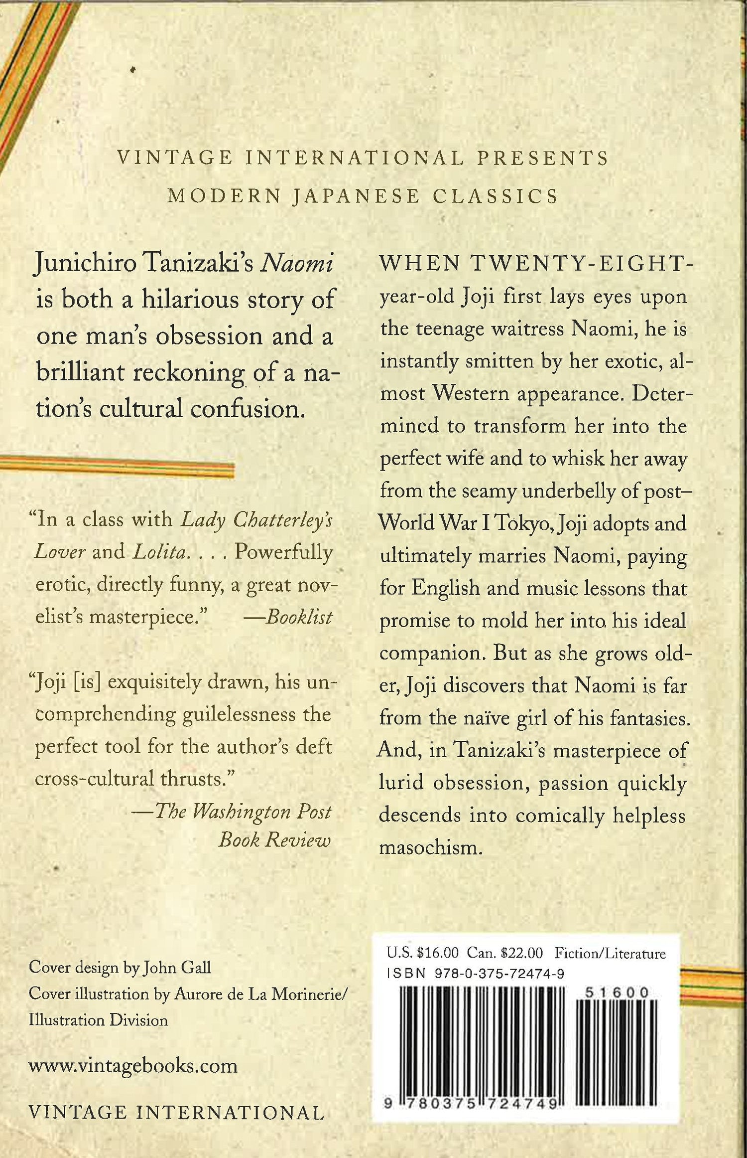 Junichiro Tanizaki's Naomi is both a hilarious story of one man's obsession and a brilliant reckoning of a nation's cultural confusion. When twenty-eight-year-old Joji first lays eyes upon the teenage waitress Naomi, he is instantly smitten by her exotic, almost Western appearance. Determined to transform her into the perfect wife and to whisk her away from the seamy underbelly of post-World War I Tokyo, Joji adopts and ultimately marries Naomi, paying for English and music lessons that promise to mold her into his ideal companion. But as she grows older, Joji discovers that Naomi is far from the naïve girl of his fantasies. And, in Tanizaki's masterpiece of lurid obsession, passion quickly descends into comically helpless masochism.