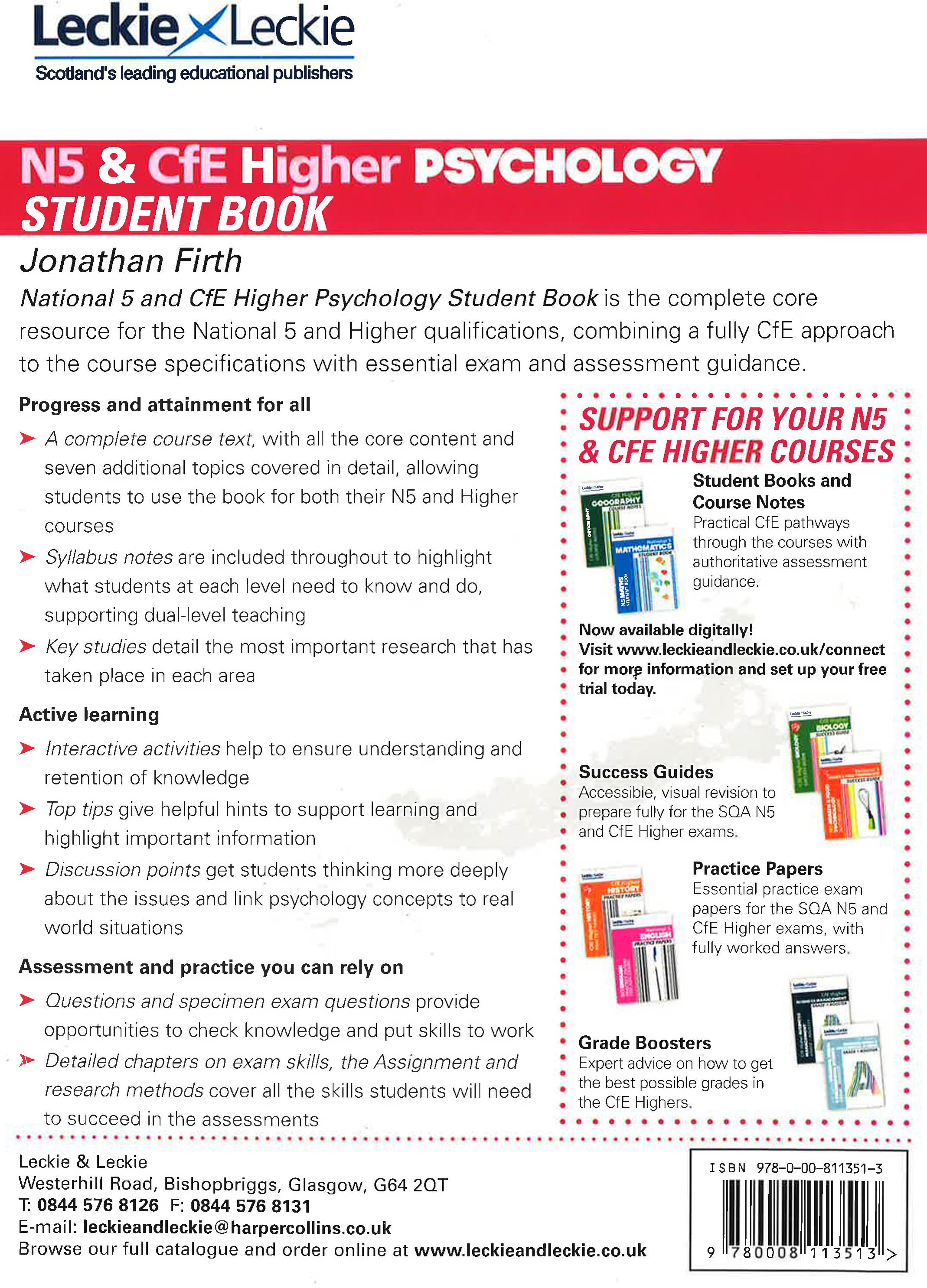 This N5 & Higher Psychology Student Book helps teachers and students map their route through the CfE programme, providing comprehensive and authoritative guidance for the course. A complete core resource for National 5 and CfE Higher Psychology with the following topics covered in detail: Approaches to Psychology, Sleep, Psychopathology, Memory, Stress, Intelligence, Research methods, Conformity, Prejudice, Non-verbal communication and Relationships. Progress and attainment for all * Includes all the core content alongside seven additional topics, allowing students to use the book for both their N5 and Higher courses * 'Syllabus notes' are included throughout to highlight what students at each level need to know and do, supporting dual-level teaching * 'Key studies' detail the most important research that has taken place in each area Active learning * Interactive activities help to ensure understanding and retention of knowledge * 'Top tips' give helpful hints to support learning and highlight important information * 'Discussion points' get pupils thinking more deeply about the issues and link psychology concepts to real world situations Assessment and practice you can rely on * Questions and specimen exam questions provide opportunities to check knowledge and put skills to work * Detailed chapters on exam skills, the Assignment and research methods cover all the skills students will need to succeed in the assessments Student Books give a practical, supportive approach to help deliver the new curriculum and offer a blend of sound teaching and learning with assessment guidance.