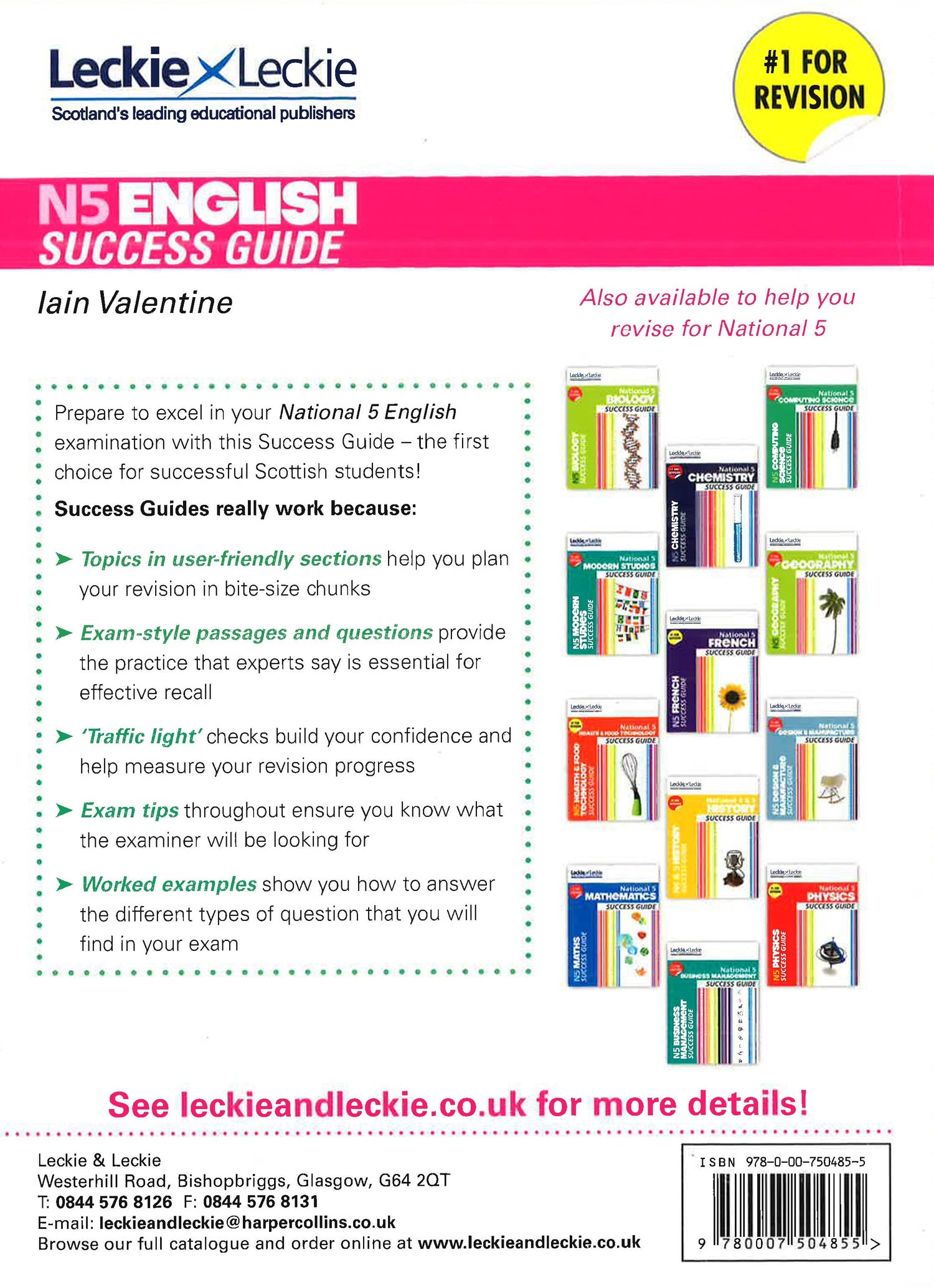 Exam Board: SQALevel: National 5Subject: EnglishFirst Teaching: 2013, First Exam: 2014 National 5 English Success Guide provides easy-to-use and value-for-money revision for all abilities and learning styles. * Colourful double-page spreads aid both comprehensive and revision planning* Topics are broken down into small, easily managed sections, complemented with lots of diagrams and illustrations to aid retention* Quick Tests and Top Tips help keep students focused on the exam's precise demands* Revision checklists help students to manage and track their progress in the lead up to the exam* A glossary presents all of the key terms and definitions essential for the exam Guidance on how the new National 5 course and assessments are structured is included. All the popular features of this tried and trusted series are retained in the new National 5 Guides.