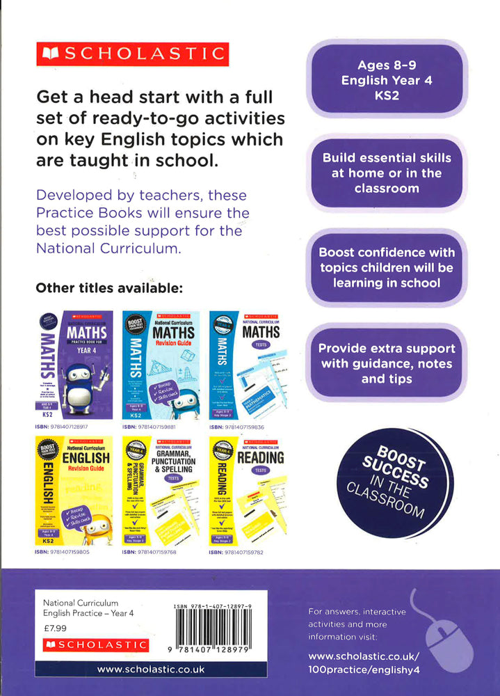 This book can help your child by providing a whole year of readyto go activities and support on key English topics which will bebeing taught in school from 2014.Did you know that your child in Year 4 will now need to; use frontedadverbials (for example: 'After a hard night's work, he was verytired.' - 'After a hard night's work' is the fronted adverbial);use commas after fronted adverbials.* Workbooks for home learning* Linked directly to what your children will be learning in school* A linked website provides additional activities, answers and supportfor parents* Developed by teachers to ensure the best possible support for thenew 2014 National Curriculum.