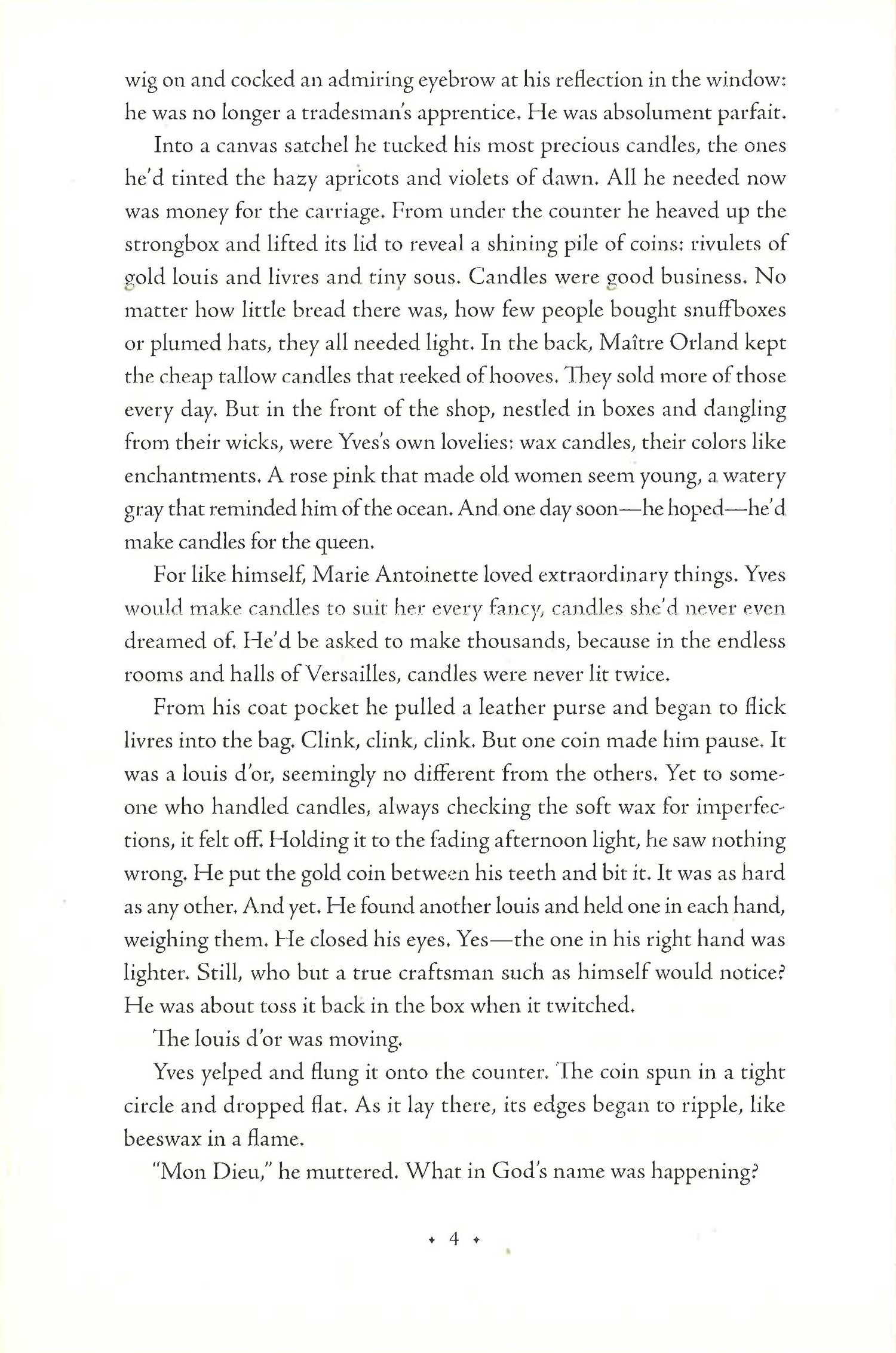 When smallpox kills her parents, Camille must find a way to provide for her younger sister while managing her volatile brother. Relying on magic, Camille painstakingly transforms scraps of metal into money to buy food and medicine they need. But when the coins won't hold their shape and her brother disappears with the family's savings, Camille pursues a richer, more dangerous mark: the glittering court of Louis XVI and Marie Antoinette.