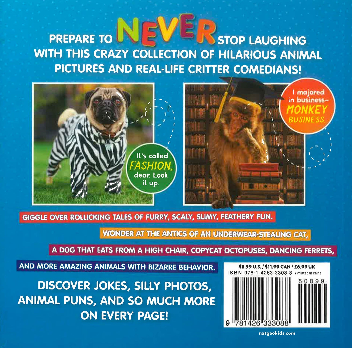 Pet puns, witty captions, Internet memes, and laugh-out-loud real-world anecdotes make this collection of hilarious animal pictures and stories a perfect package for jokesters and animal lovers. This silly snack-size book is packed with strange facts, comical tales, and adorable photos featuring all kinds of our furry, scaly, feathery, and slimy friends. Get the scoop on famous critter comedians; delight in the hijinks of an underwear-stealing cat; discover a dog who dines from a highchair; or bust a gut laughing at bizarre animal behaviors from copycat octopuses to dancing ferrets.