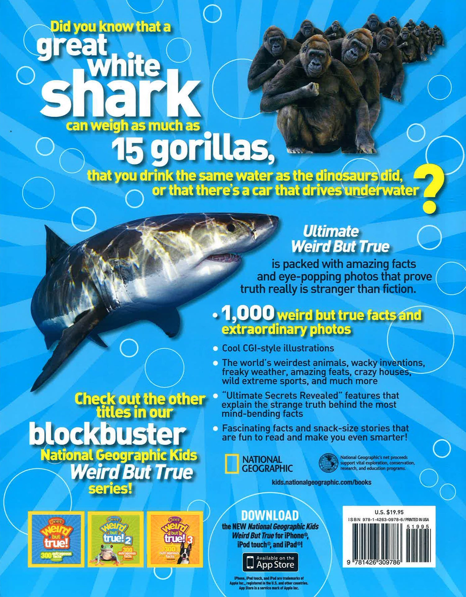 Welcome to Ultimate Weird But True – where truth REALLY gets stranger than fiction! Even weirder, wackier and wilder, it’s the ultimate rollercoaster ride through 1000 totally mad facts! Put together by those clever National Geographic bods, and packed with cool CGI images and amazing statistics, this super-sized book is the place to get entertained while boosting your smarts. With heaps of incredible stories topped off with 200 cool themed spreads, plus “Ultimate Secrets Revealed” panels that explain the most mind-bending facts of all, it’s the ultimate way to blow your mind and make your brain boggle!