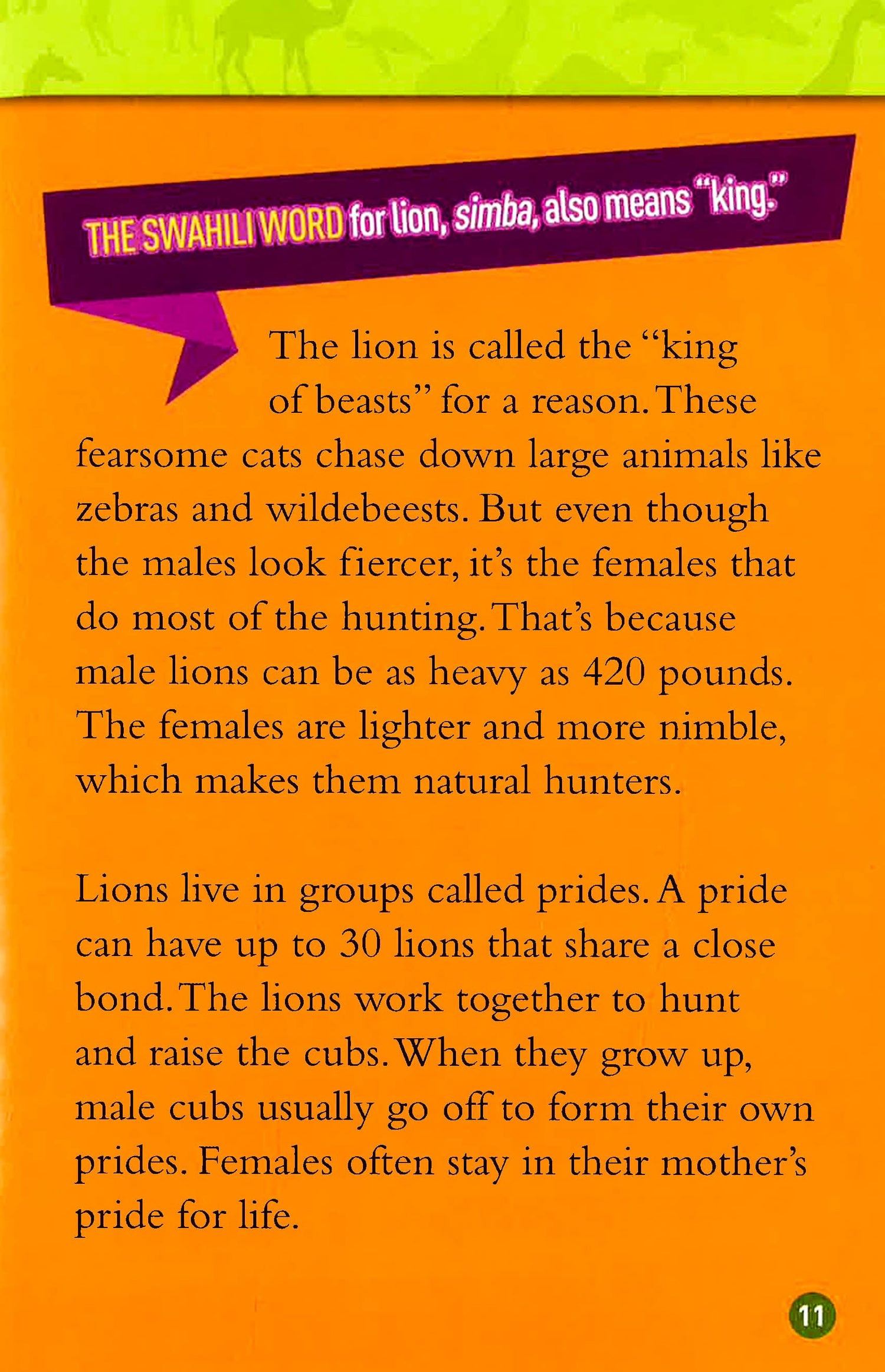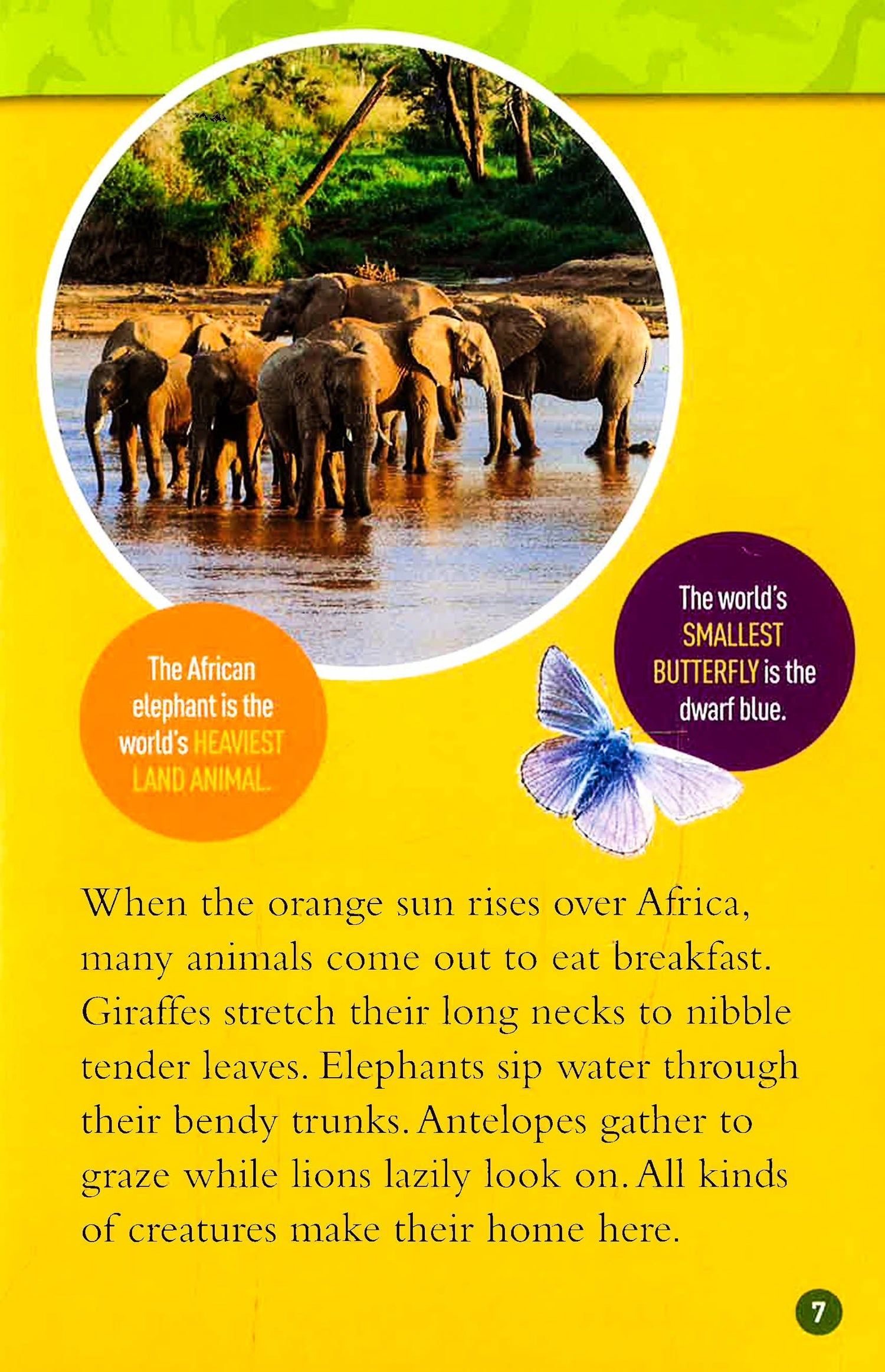 Explore the amazing animals of Africa! Travel through the savanna, jungle, and desert to meet lions, elephants, giraffes, and more animals in this leveled reader about the most popular African safari animals that's perfect for advanced readers. Packed with weird-but-true facts and tons of animal info, this Level 3 Reader tours the diverse grasslands, watering holes, rain forests, and deserts of Africa. Get up close to some of the most amazing animals in Africa, including big cats, crocs, pangolins, hippos, rhinos, elephants, and more. Find out how fast a cheetah can sprint, how much a croc can fit in its massive jaws, and more wild stuff. Kids also get an introduction to the importance of animal conservation. National Geographic Fact Readers feature the same expert-vetted running text as traditional readers-with a bonus of 100 fun facts sprinkled throughout! A fact round-up at the end of each book lets kids review what they've learned. (Plus, they can impress their friends with their animal expertise!)