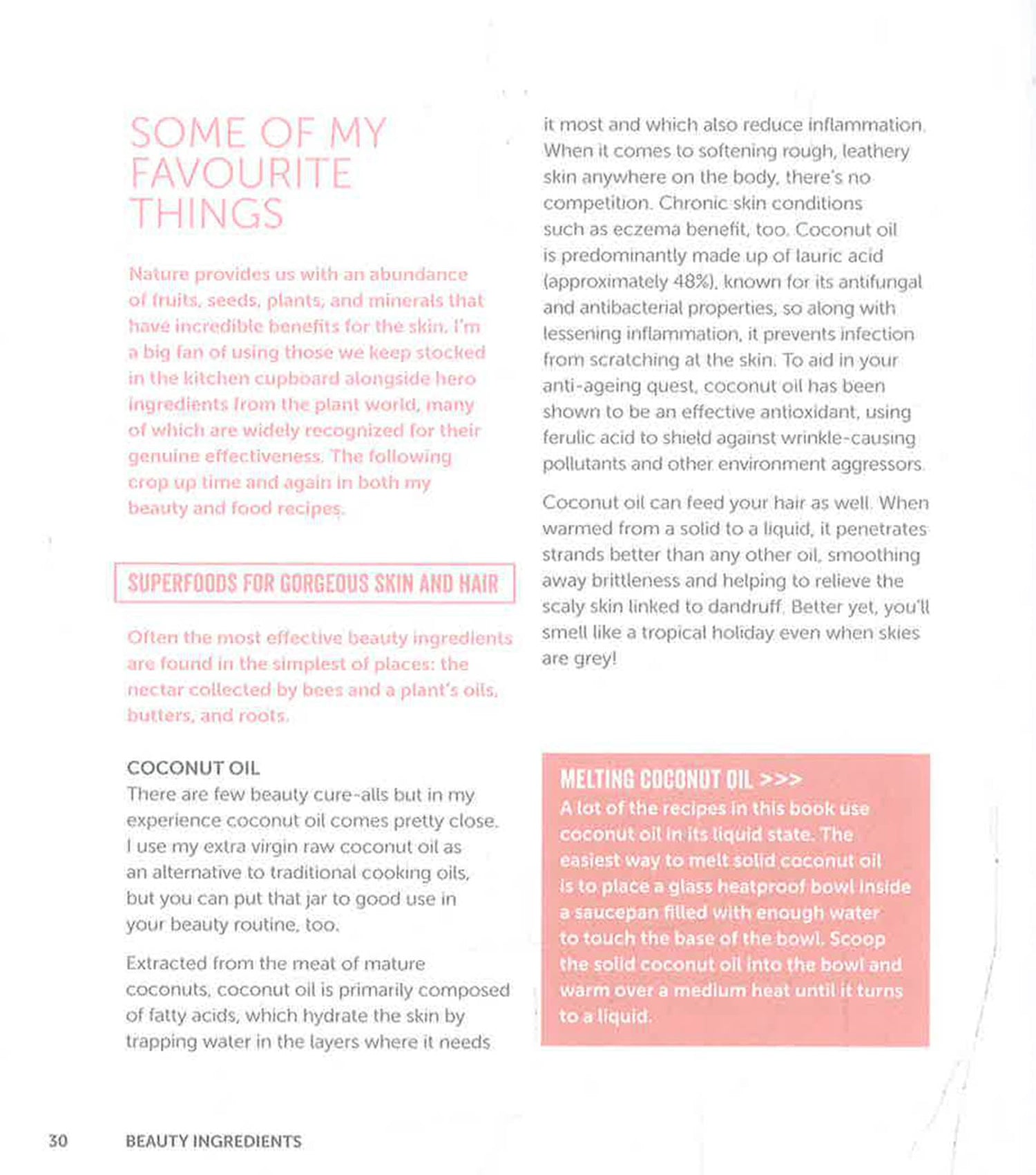 Tapping into the current trend for making your own beauty treatmentys as an alternative to store-bought products that can be pricey and are often packed with chemicals, every recipe in Natural Beauty with Coconut Oil is super easy to make at home, without any specialized equipment. A few recipes are as simple as coconut oil enhanced with a couple of drops of essential oil, whereas others make use of things already in your home, like a body scrub made of used coffee grounds that would otherwise be thrown away.