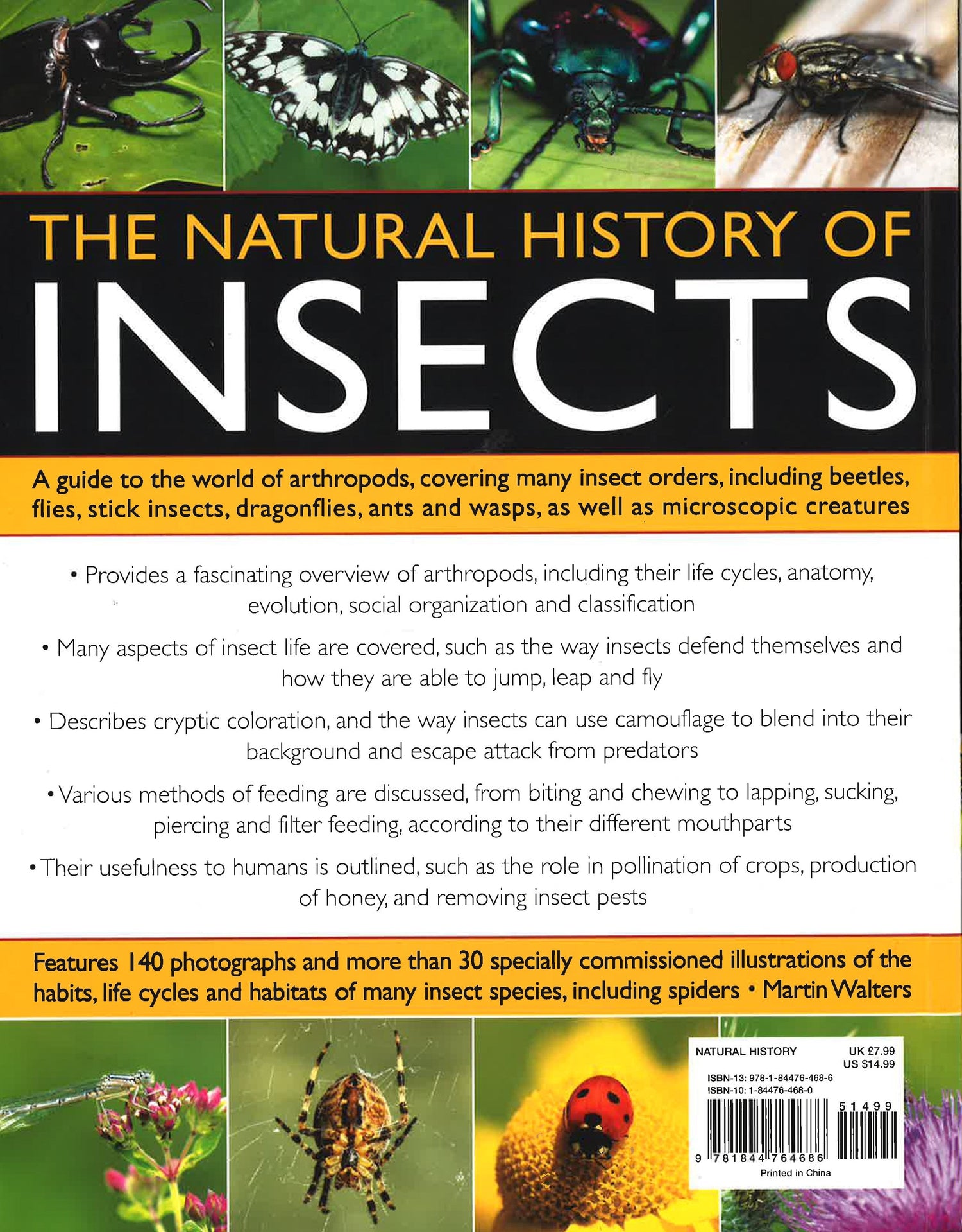 This title offers a guide to the world of arthropods, covering many insect orders, including beetles, flies, stick insects, dragonflies, ants and wasps, as well as microscopic creatures. It provides a fascinating overview of insects and spiders, including their habitats and classification, all shown in over 195 beautiful photographs and illustrations. All aspects of insect life are covered, such as the way insects defend themselves and how they are able to jump, leap and fly. It describes cryptic coloration, and the way insects can use camouflage to blend into their background and escape attack from predators. It offers various methods of feeding are discussed, from biting and chewing to lapping, sucking, piercing and filter feeding, according to their different mouthparts. It outlines their useful role in pollination of crops, production of honey, and removing insect pests. In the arthropoda phylum, insects are one of the most successful species, and spiders are one of the largest groups. This book studies how they organize their lives. The first section provides information of every aspect of insect life: evolution, anatomy, life cycles, flight and social organization.