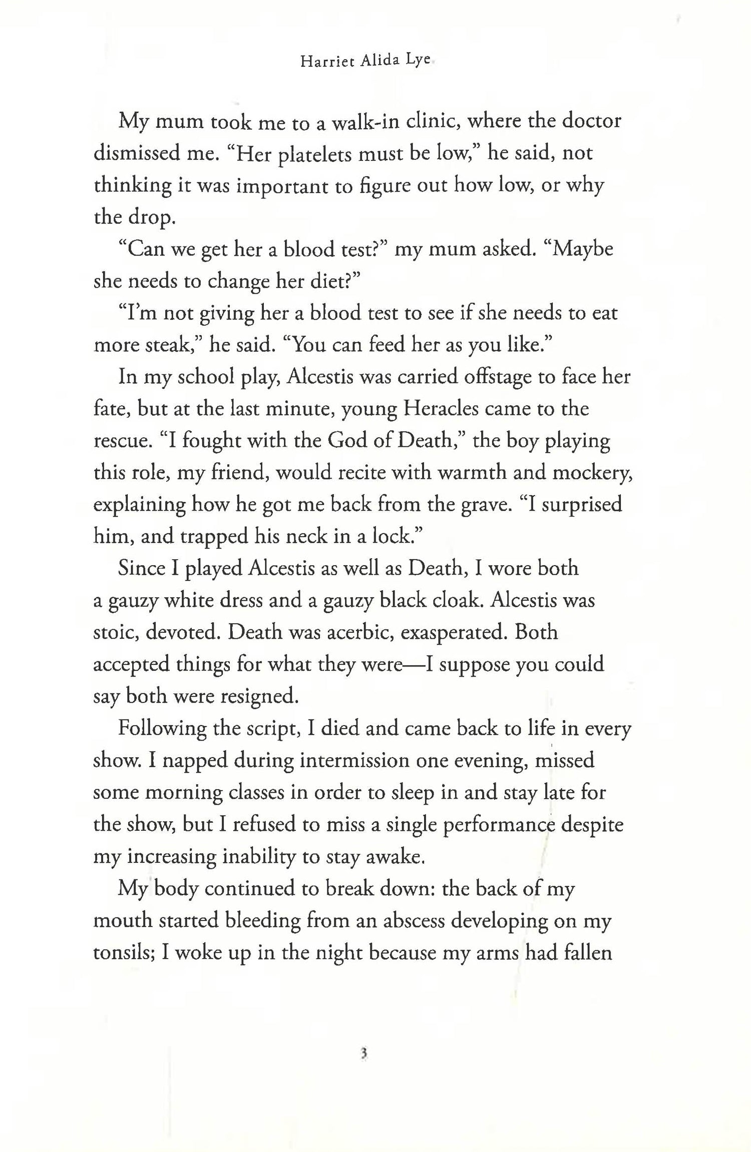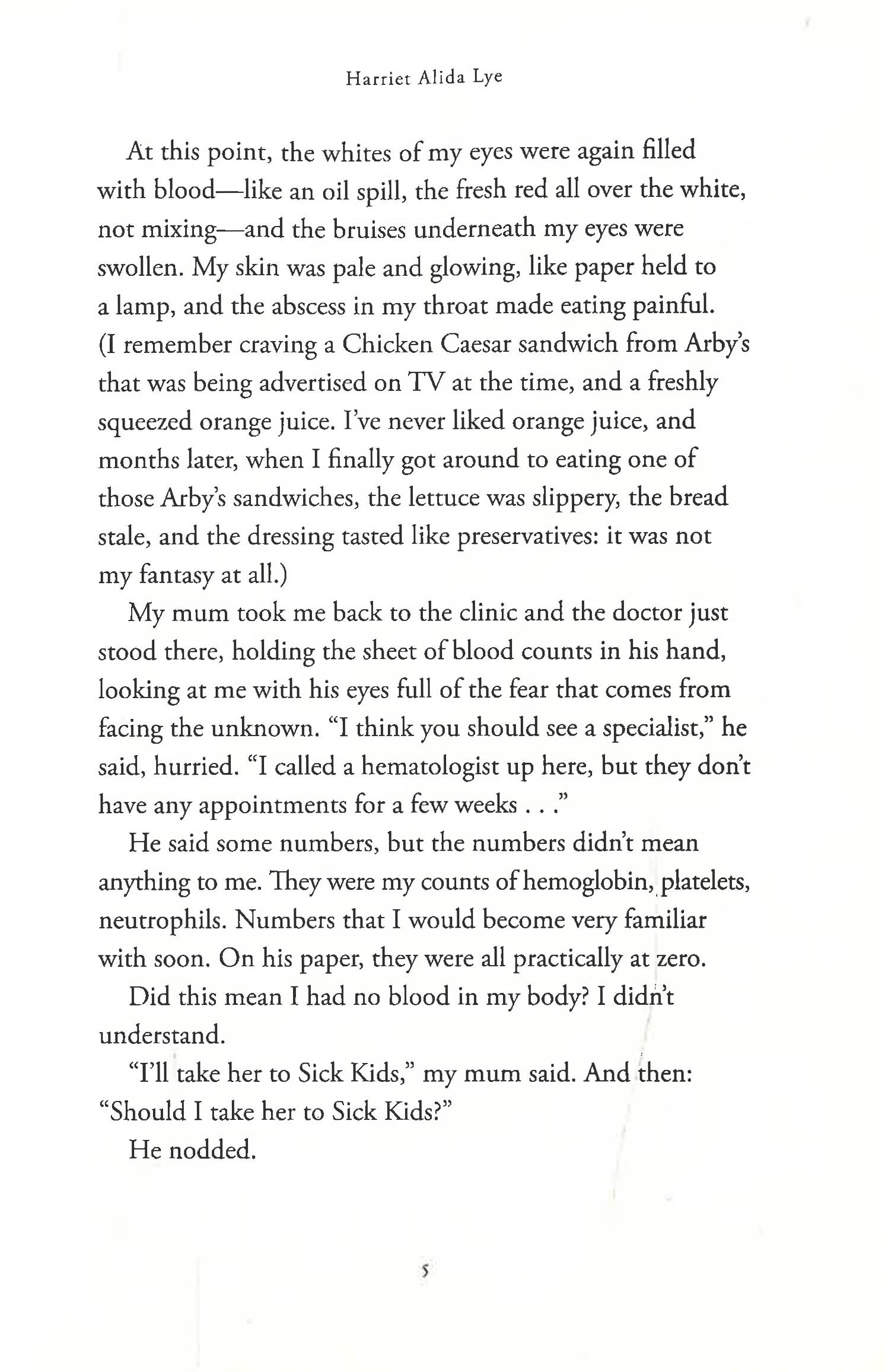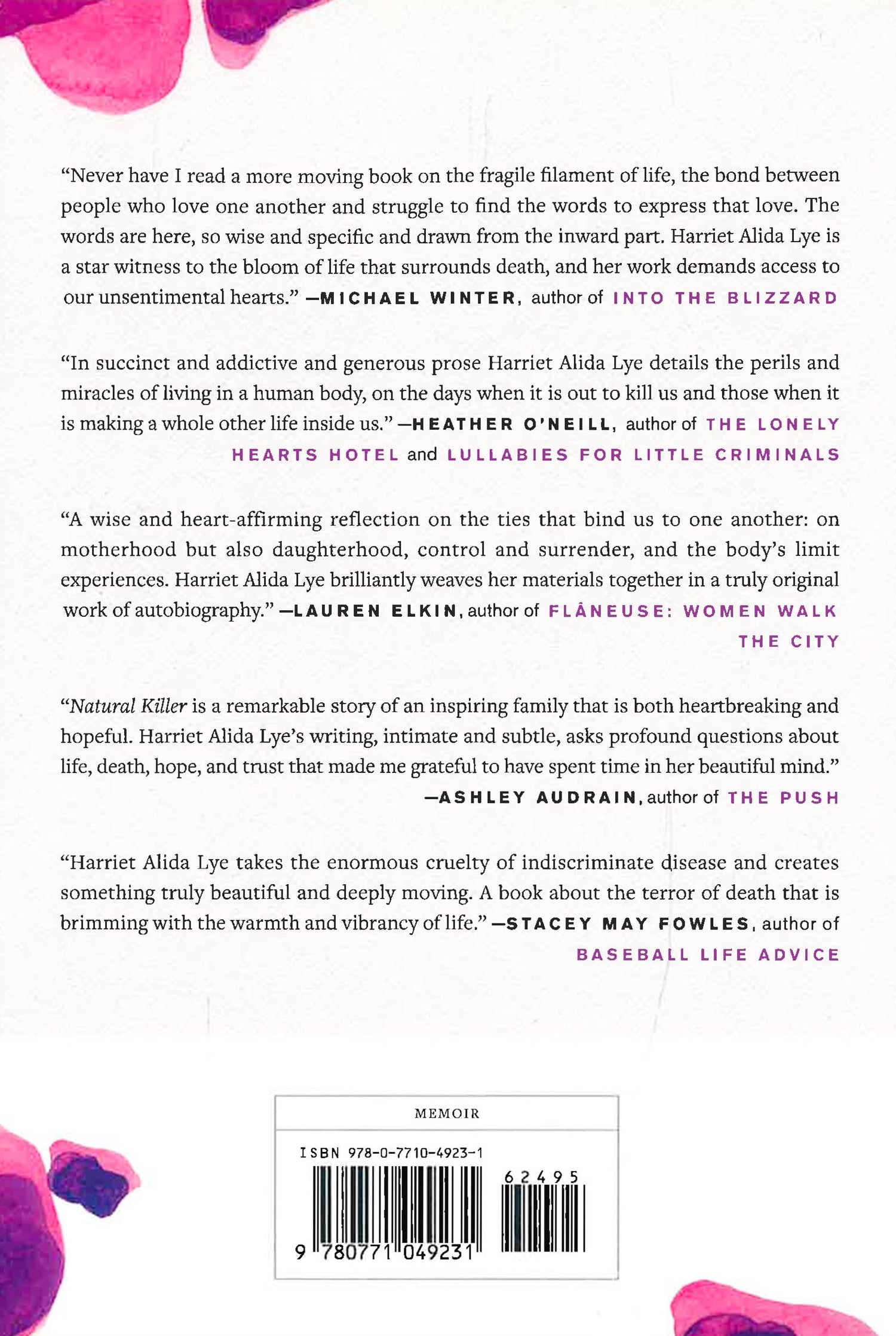 I need people to know that I exist, that their experiment worked, that by some combination of luck and science, I'm alive. In this harrowing and intimate memoir, Harriet Alida Lye explores how, at just fifteen years old, she was diagnosed with a form of leukemia called Natural Killer, named the rarest and worst malignancy. The average survival time of patients with this diagnosis is fifty-eight days. There are no known survivors. There were no known survivors. Fifteen years after Harriet's diagnosis, she became pregnant, despite having been told that her chemotherapy treatment would likely make conception impossible. To be a mother is to make a death, as death is bound up in life. She knew her body had the ability to create death. She never trusted, was told to not even imagine, that it also had the power, that magical banality, to create life. Weaving in source material from the year she spent in hospital, written by both of her parents and her teenage self, this personal reflection is told through a seamless blend of narrative, snapshots, journal entries, and blog updates posted for friends and family. With probing lyricism and searing honesty, Natural Killer explores what it's like to live with a life-threatening illness and survive it; what it means for a body to turn against itself, to self-destruct from within; and what it takes to regain trust in a body that has committed the ultimate betrayal.