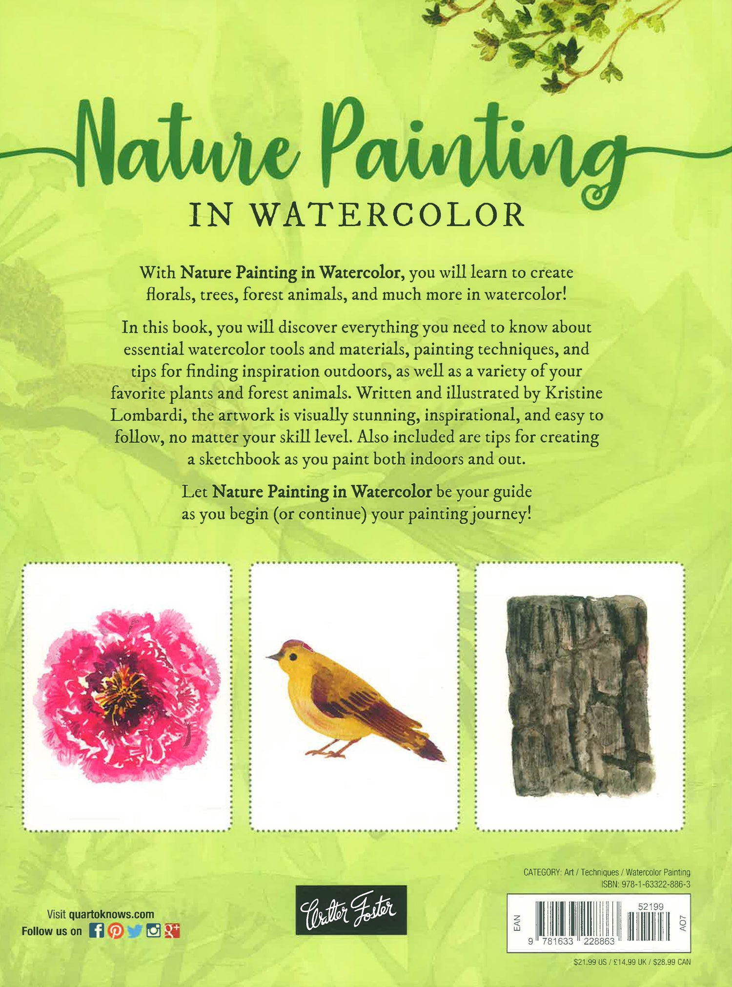 The step-by-step projects cover popular natural painting subjects, including the ones already listed here as well as rocks, mushrooms, buds, blooms, big and small trees, and forest animals. All are illustrated and painted in the author/artists’s signature contemporary watercolor style.
