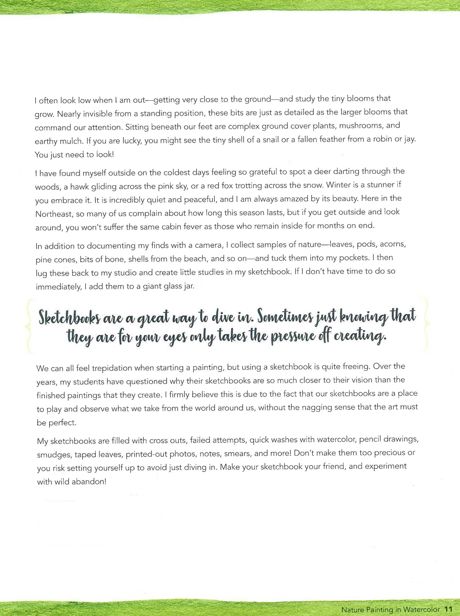And if you can’t get outside, we’ve got you covered as well, with suggestions for where to find images online and photos to use as references. Also learn to sketch and keep a detailed sketchbook—skills that will help you when you get started on the step-by-step painting projects in the largest section of the book.