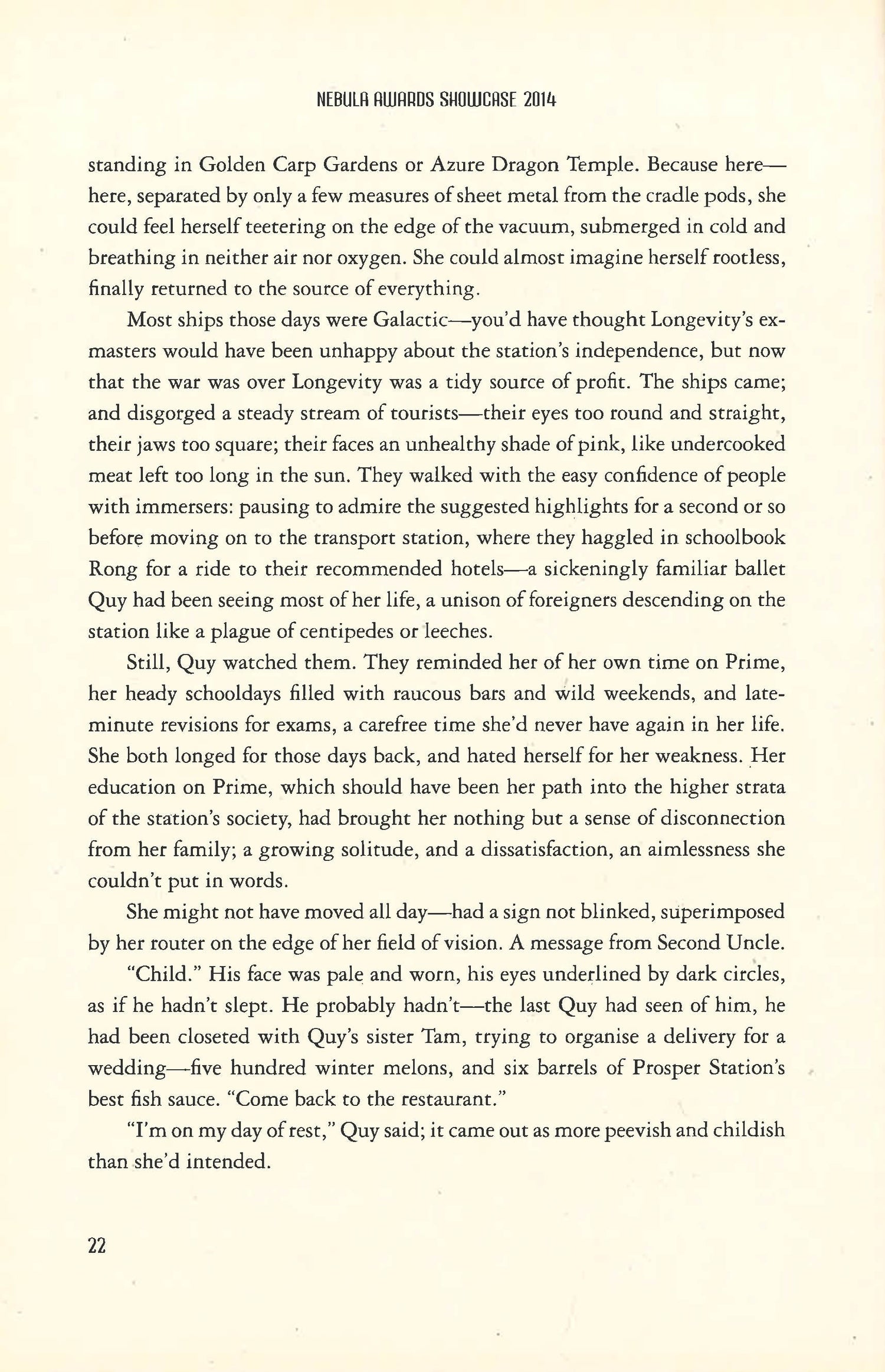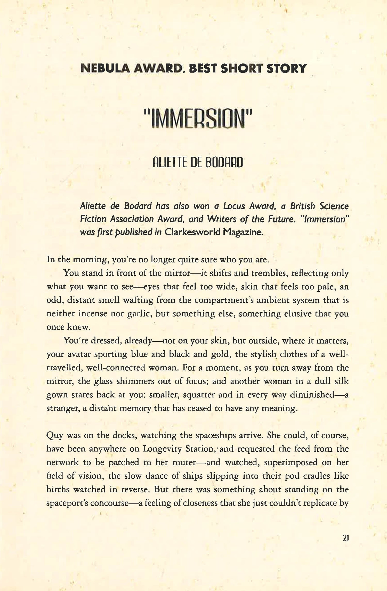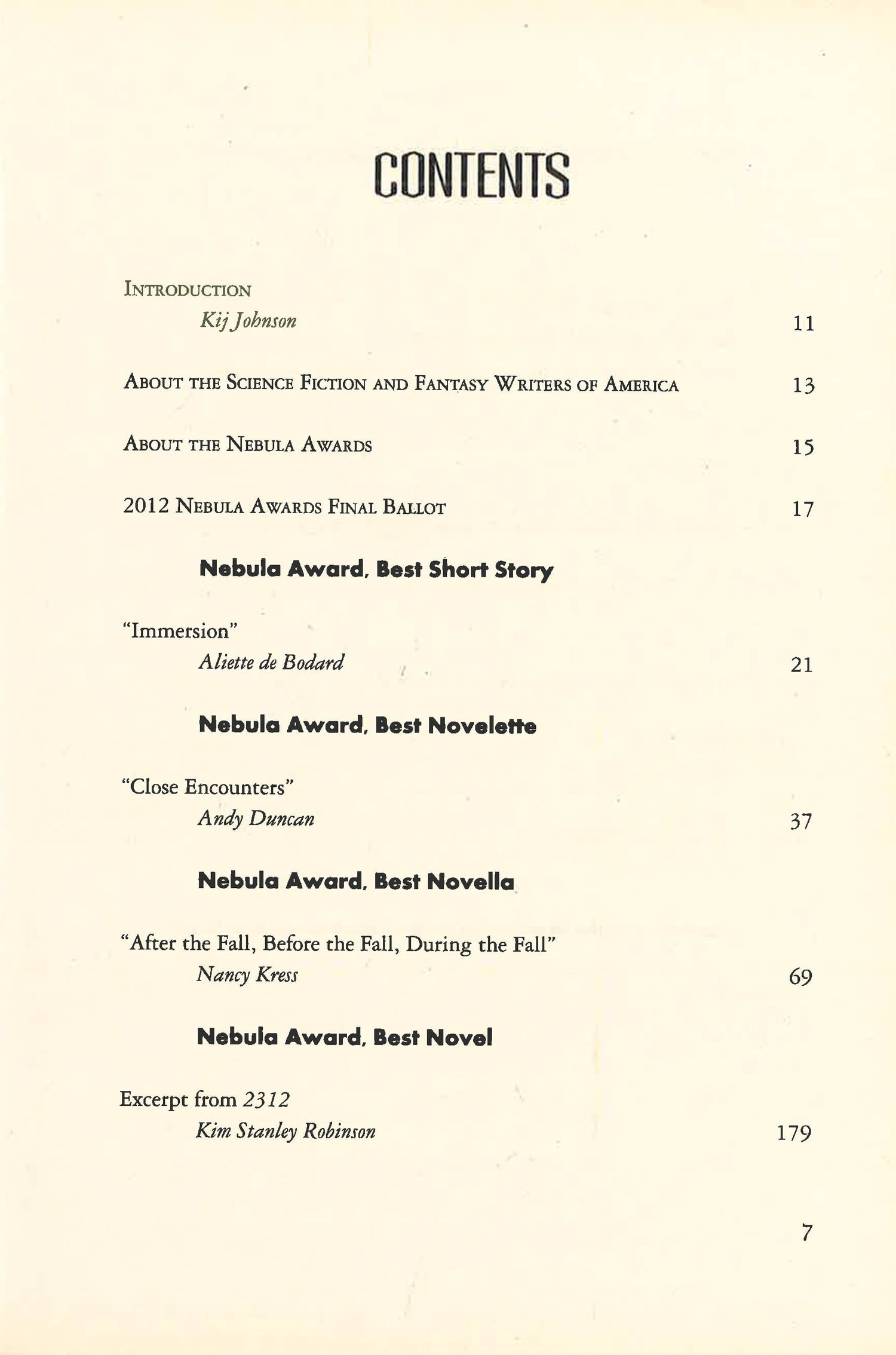 The latest volume of the prestigious anthology series, published annually across six decades! The Nebula Awards Showcase volumes have been published annually since 1966, reprinting the winning and nominated stories in the Nebula Awards, voted on by the members of the Science Fiction & Fantasy Writers of America(R) . The editor selected by SFWA's anthology committee (chaired by Mike Resnick) is American fantasy writer Kij Johnson, author of three novels and associate director of the Center for the Study of Science Fiction at the University of Kansas. This year's Nebula winners, and expected contributors, are Kim Stanley Robinson, Nancy Kress, Andy Duncan, and Aliette de Bodard, with E.C. Myers winning the Andre Norton Award for Young Adult Science Fiction and Fantasy Book.