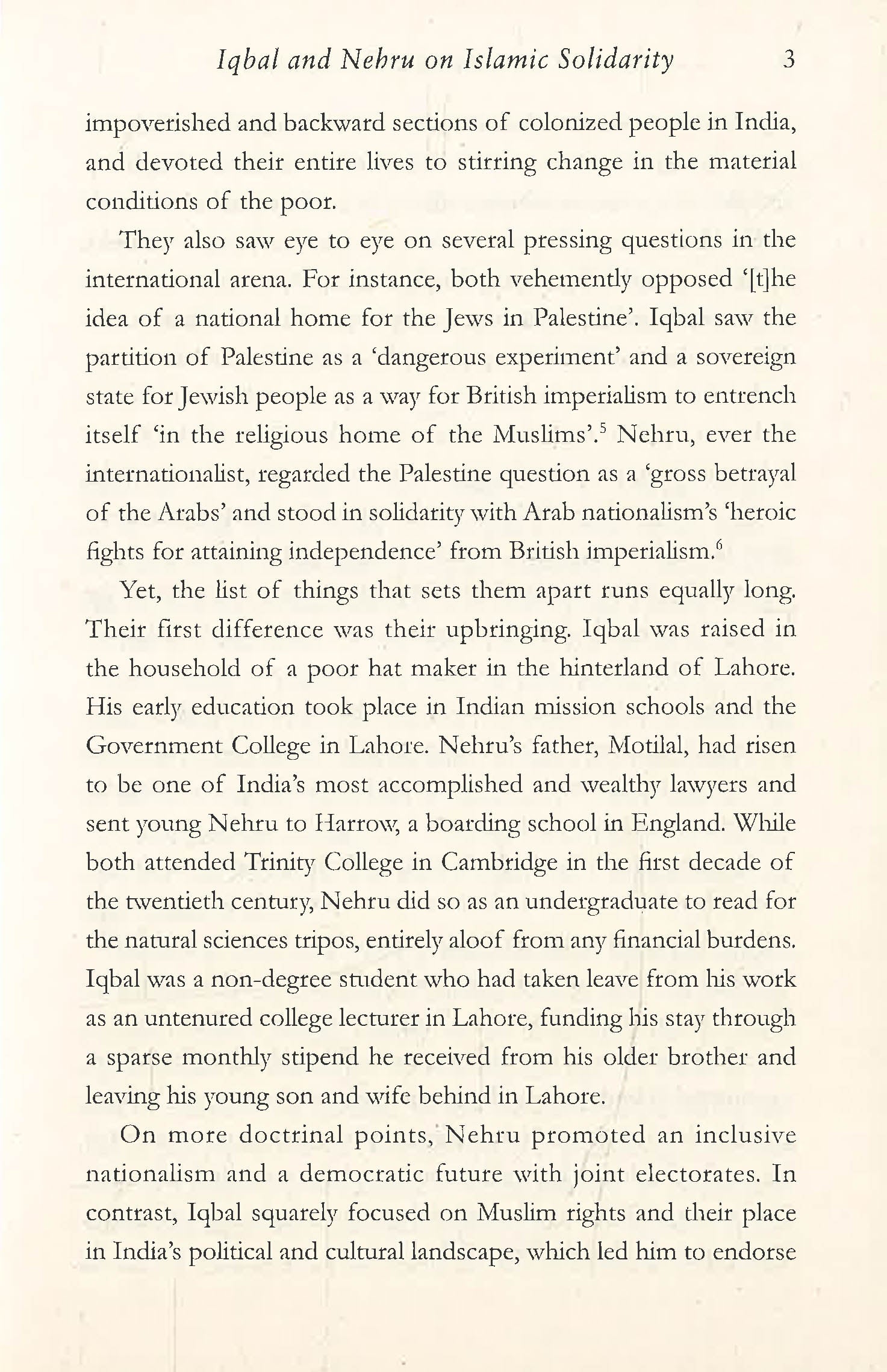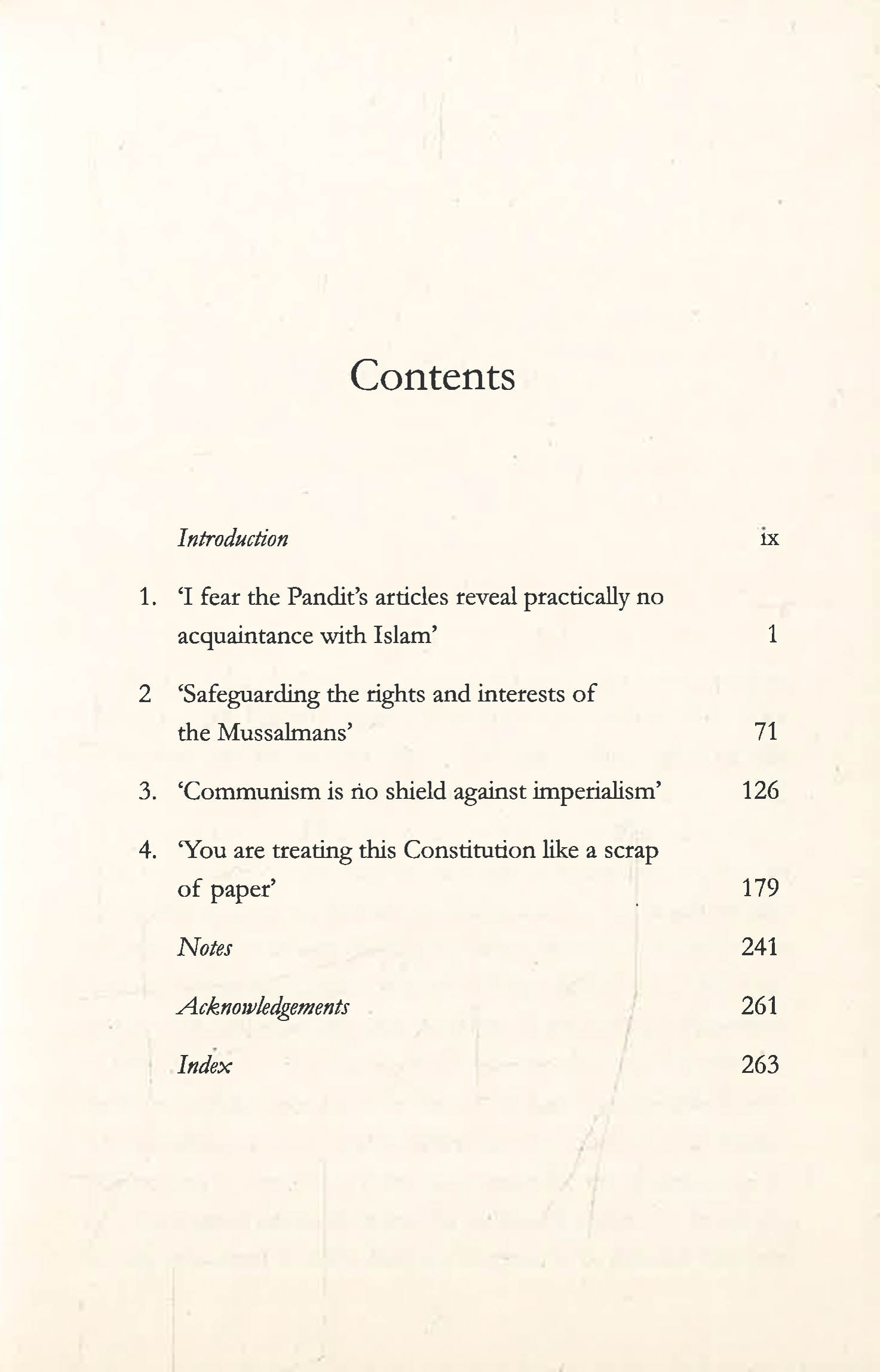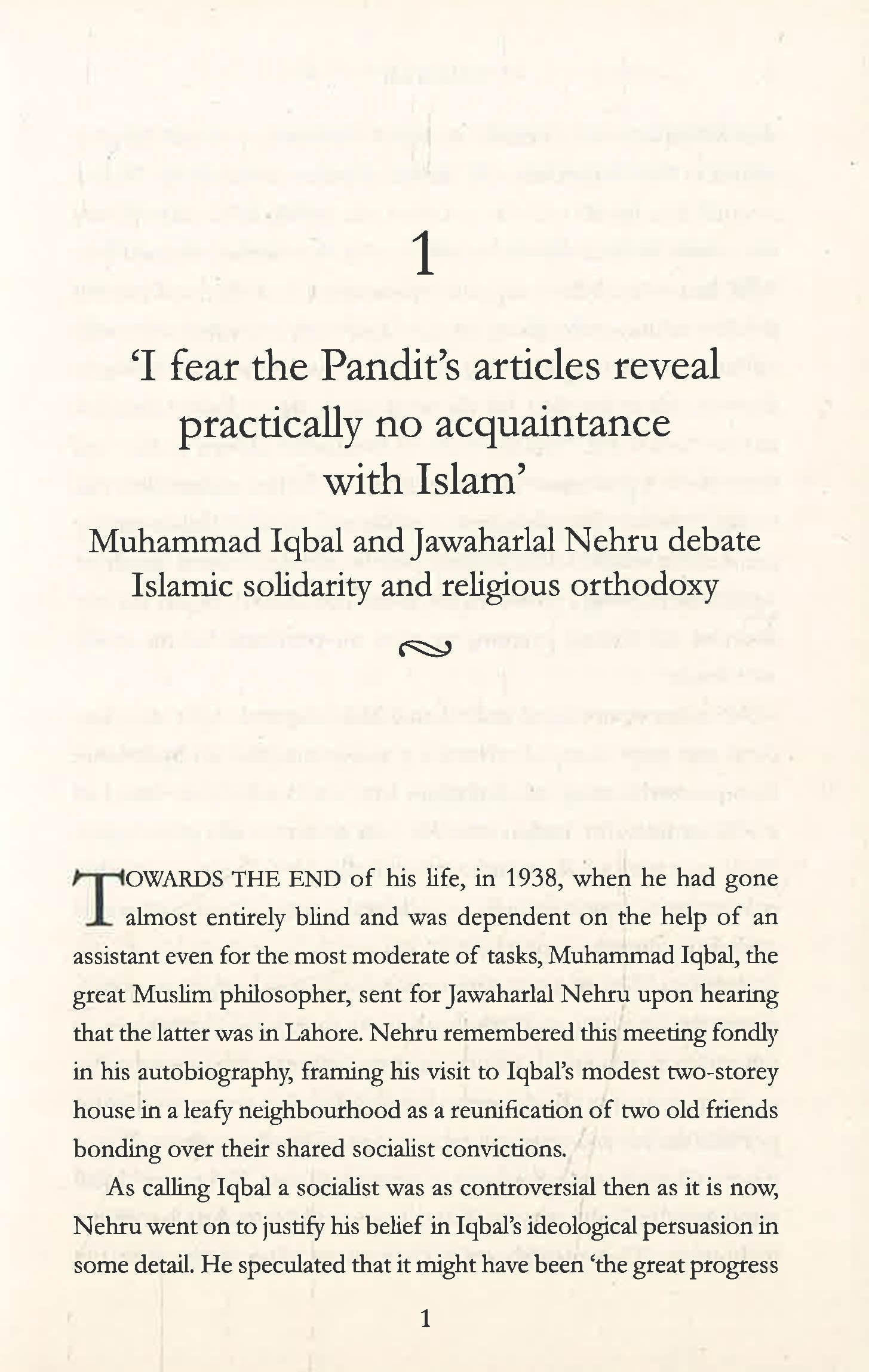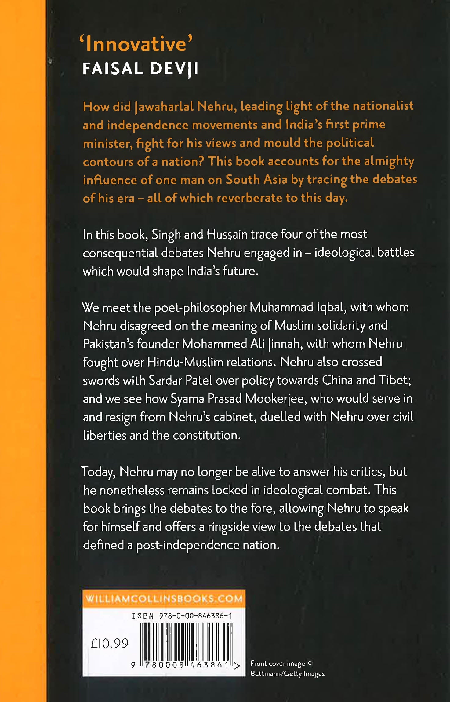 It examines the founder of Pakistan Mohammad Ali Jinnah and his cause of Hindu-Muslim unity, Shyama Prasad Mookerjee of the Hindu Mahasabha and his fierce defence of the constitution, the Congress leader Sardar Patel, with whom Nehru often disagreed about the threat of China, and Mohammad Iqbal, the poet and politician whose letters on Muslim solidarity were often issued from a prison cell.