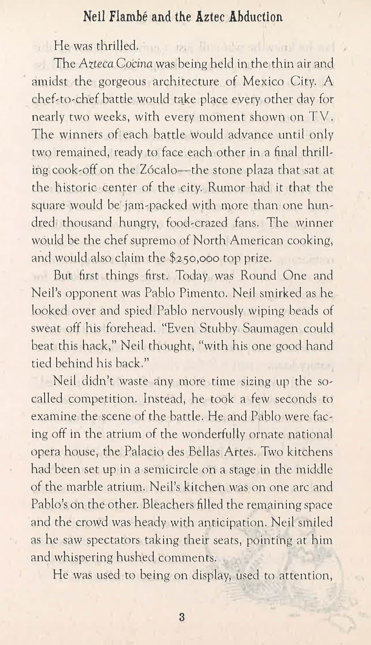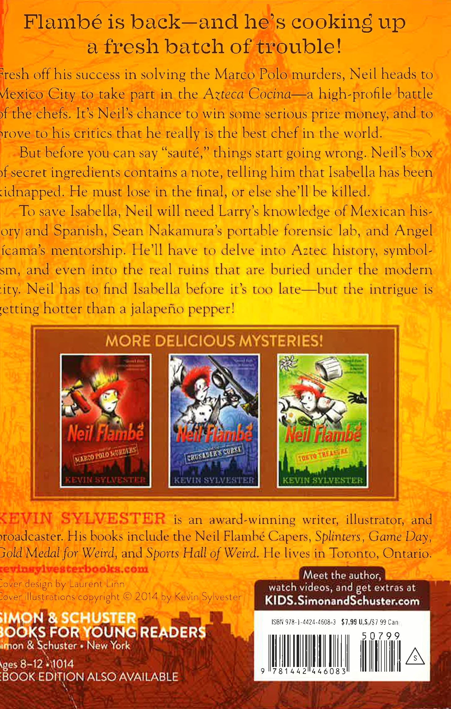 There's mayhem in Mexico in this full-flavored mystery, the second book in The Neil Flambé Capers. Teenage wunderchef--and budding detective--Neil Flambé heads to Mexico City to take part in the Azteca Cocina, a two-week battle of the chefs. But he's off to an unsettling start: His box of secret ingredients contains a note that says his girlfriend, Isabella, has been kidnapped. He must lose in the final, or else she'll be killed.