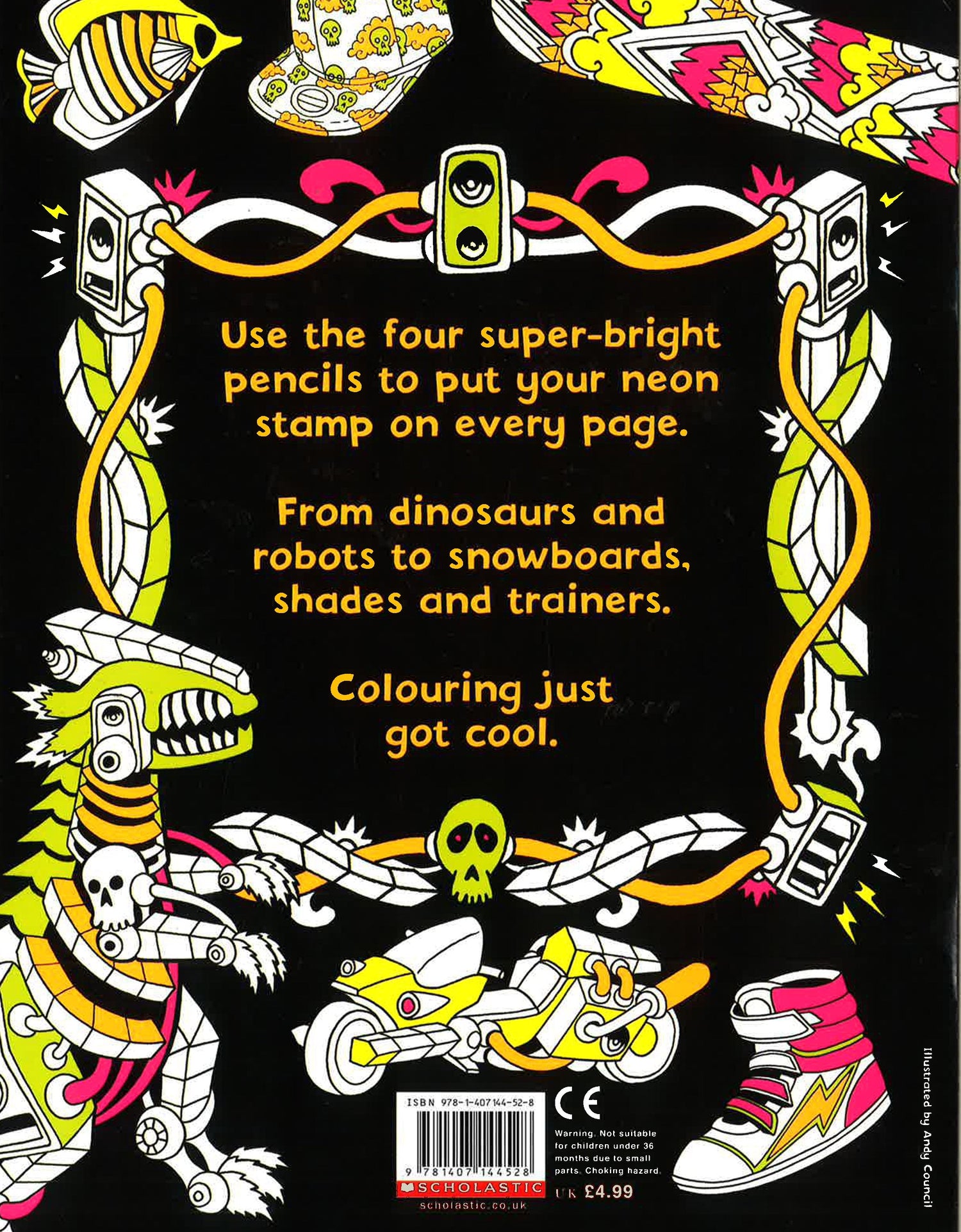 Scholastic Activities - a brand-new range of activity and colouring books for ages 3+, 5+ and 7+. Collect them all! A fun-filled colouring book, perfect for children aged 7+. Get bold and bright with the Neon Colouring Book. Using the four brilliant neon colouring pencils included, transform pictures of clothes, buildings, patterns, cars and much more into a rainbow of neon colours. You'll never want to colour with regular colouring pencils again!