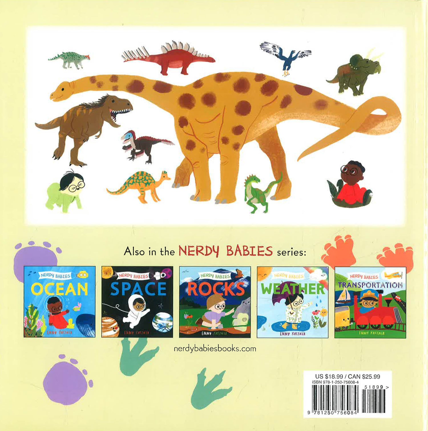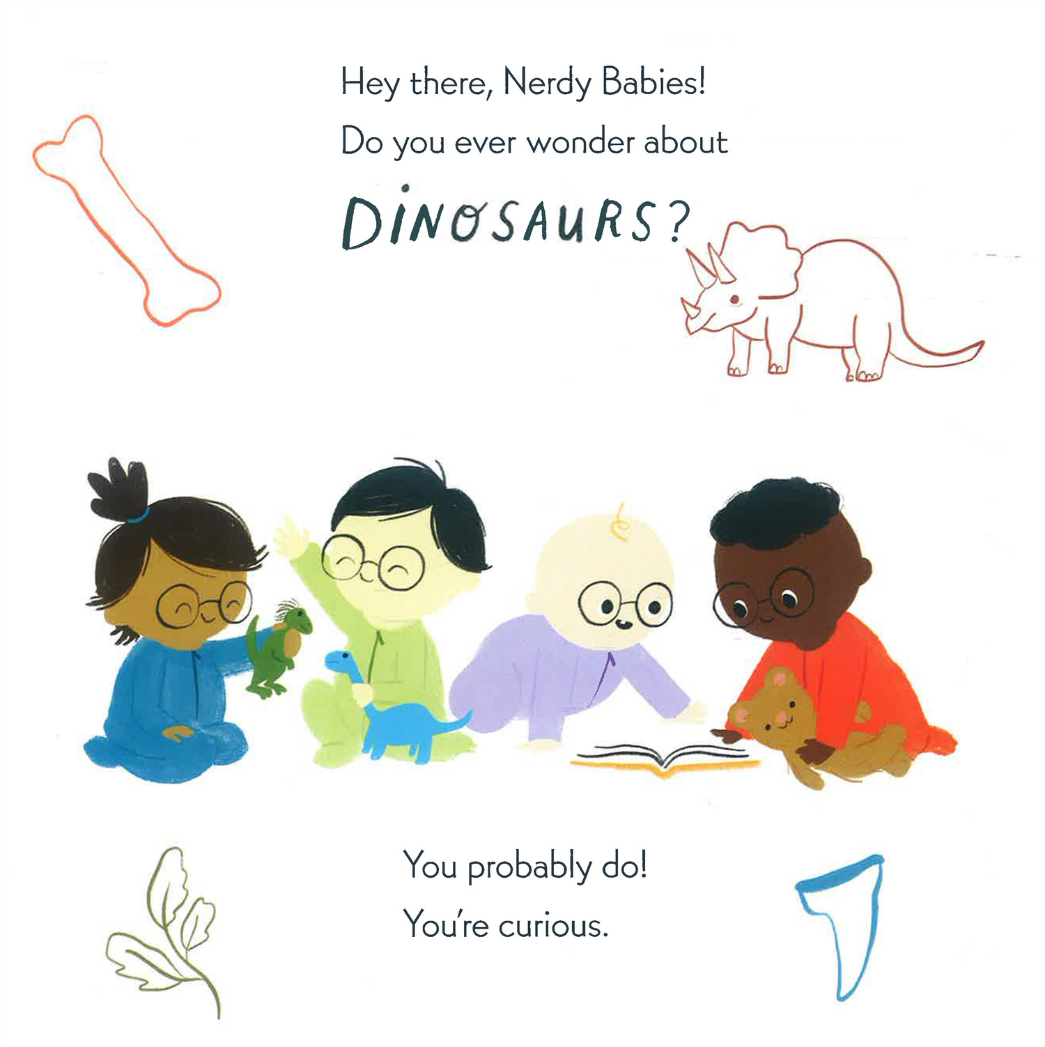 In Nerdy Babies: Dinosaurs, follow our intrepid babies into the Mesozoic Era. Experience the different shapes, sizes, and colors of the reptiles that roamed the Earth before us. Plus, learn about how dinosaurs evolved over millions of years until becoming extinct in this simple text written in question-and-answer format.