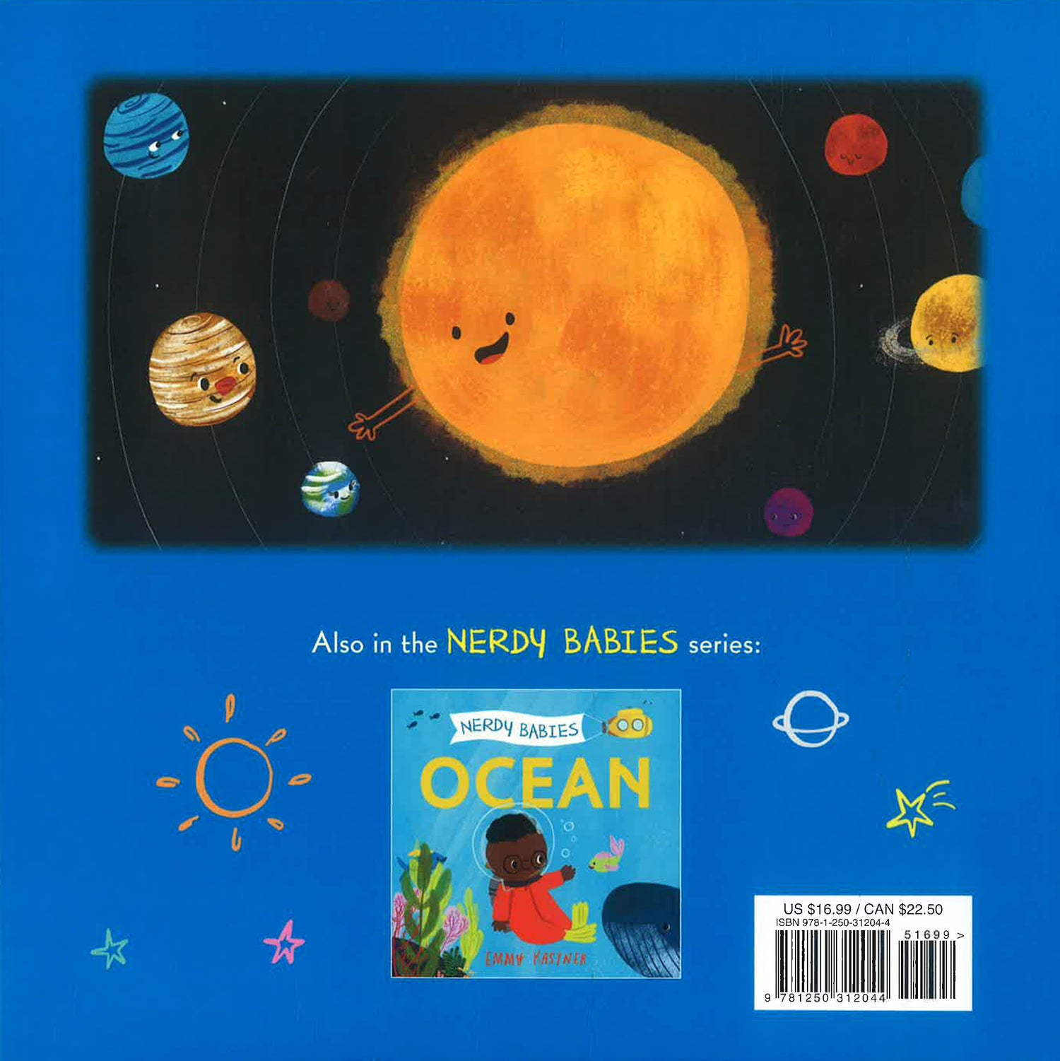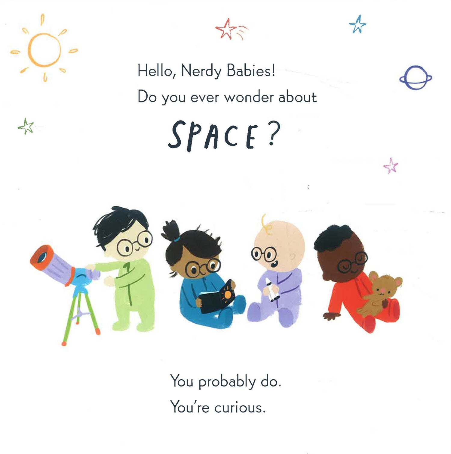 In Nerdy Babies: Space, follow our intrepid infants into the great unknown. Check out the moon and the sun and all the planets in our solar system. Plus, learn about gravity and orbits in this simple text written in question and answer format.