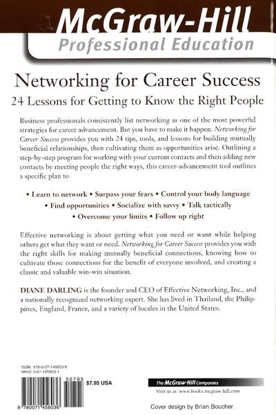 This book provides 24 lessons for getting to know the right people. Business professionals consistently list networking as one of the most powerful strategies for career advancement. But you have to make it happen. "Networking for Career Success" provides you with 24 tips, tools, and lessons for building mutually beneficial relationships, then cultivating them as opportunities arise.Outlining a step-by-step program for working with your current contacts, then adding new contacts by meeting people the right ways, this career-advancement tool outlines a specific plan to: learn to network; surpass your fears; control your body language; find opportunities; socialize with savvy; talk tactically; overcome your limits; and, follow up right. Effective networking is about getting what you need or want while helping others get what they want or need. "Networking for Career Success" provides you with the right skills make mutually beneficial connections, knowing how to cultivate those connections for the benefit of everyone involved, and creating a classic and valuable win-win situation.