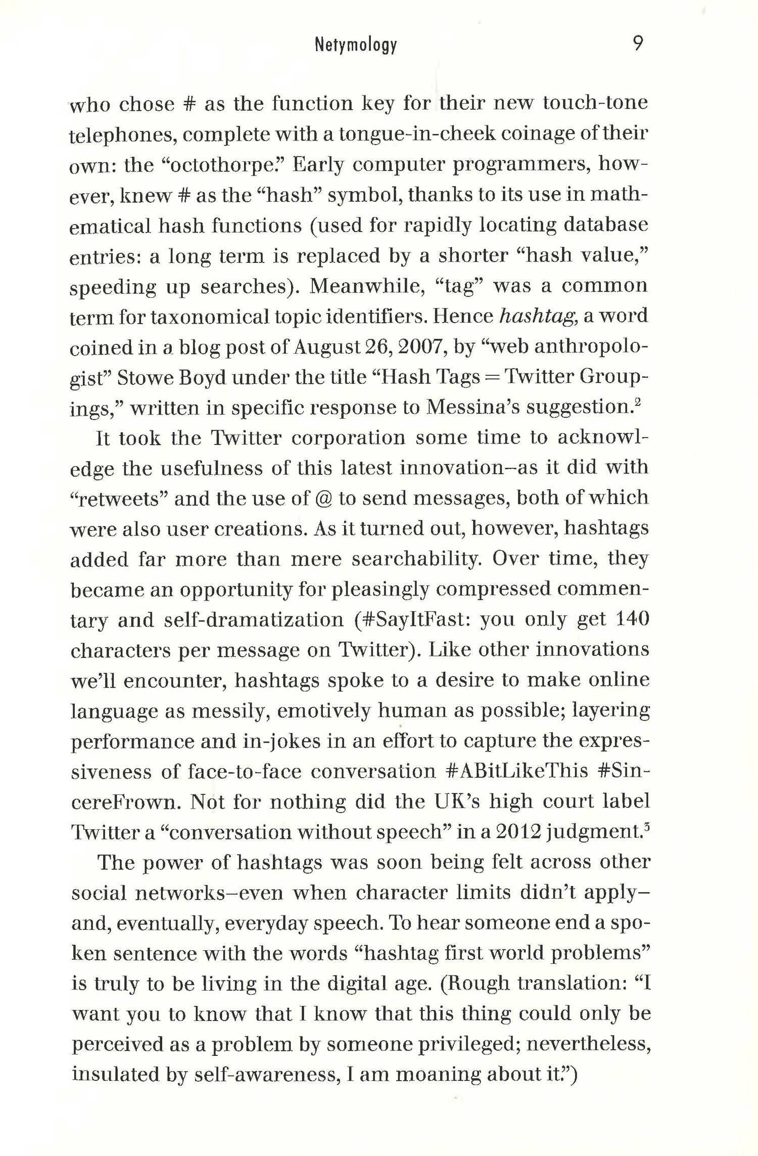 Composed of 100 bite-sized entries of 400 to 600 words each, Netymology weaves together stories, etymologies and analyses around digital culture's transformation and vocabulary. Chatfield presents a kaleidoscopic, thought-provoking tour through the buried roots of the symbols, speech, and mannerisms we have inherited from the digital age: from the @ and Apple symbols, to HTML and Trojan horses, to the twisted histories of new forms of slang, memes, text messages and gaming terms; how language itself is being shaped by technology, how it is changing us.
