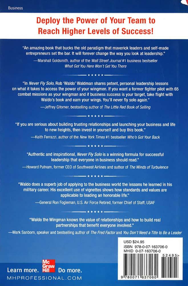 "In Never Fly Solo, Rob 'Waldo' Waldman shares potent, personal leadership lessonson what it takes to access the power of your wingmen. If you want a former fi ghter pilot with 65combat missions as your wingman and if business success is your target, take flight withWaldo's book and earn your wings. You'll never fly solo again."