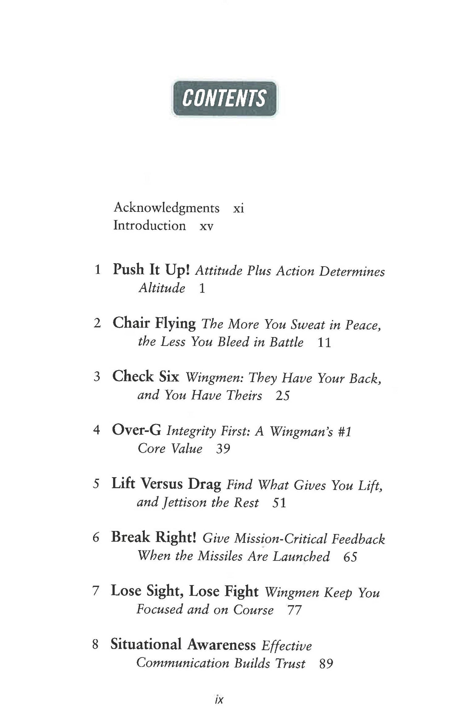 Like the world of aerial combat, today's high-stakesbusiness world operates faster than the speed ofsound. Teamwork and trust are critical for thwartingthe missiles of fear, change, and risk that too oftensend even the most seasoned professional into adownward spiral.
