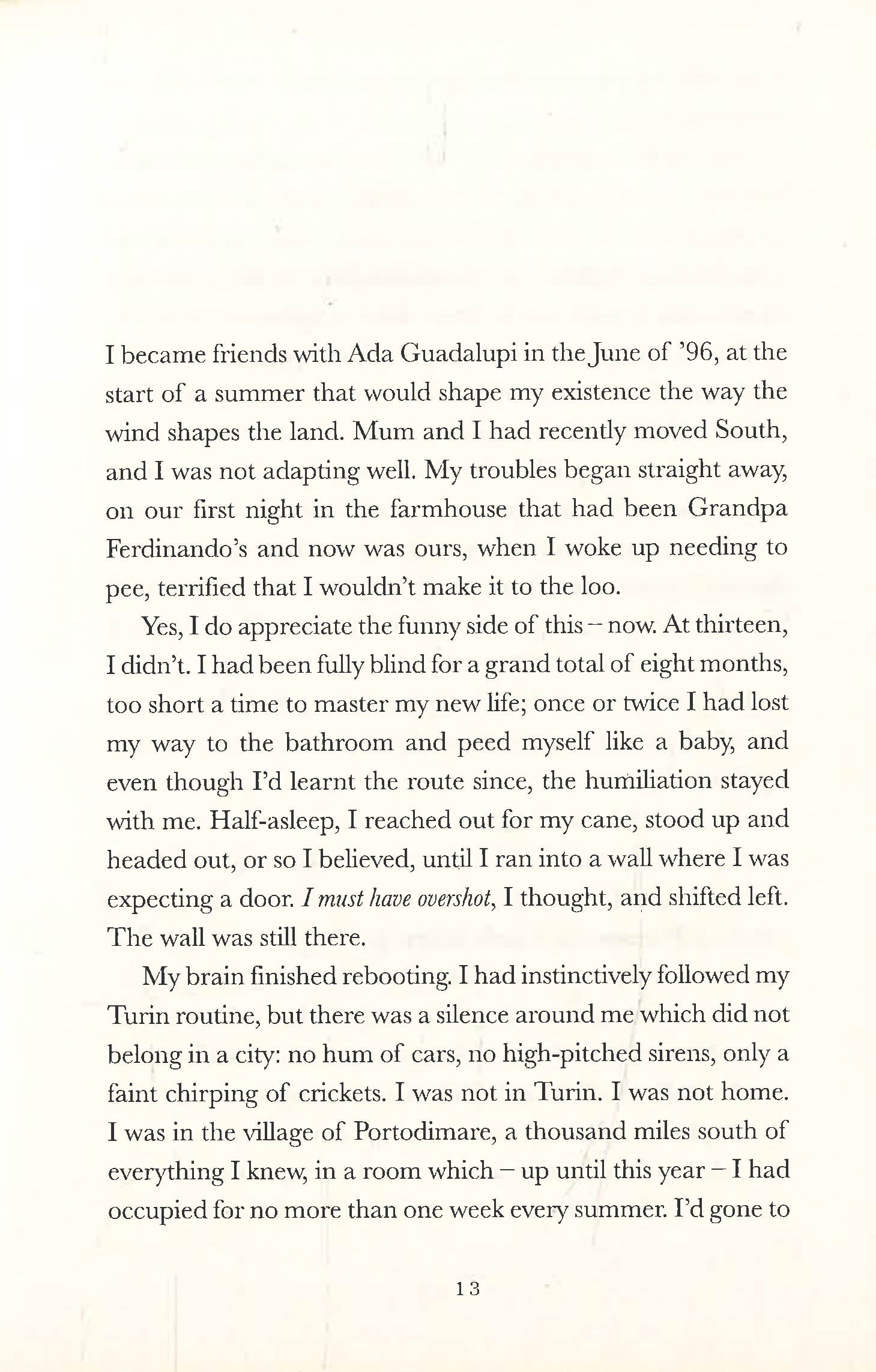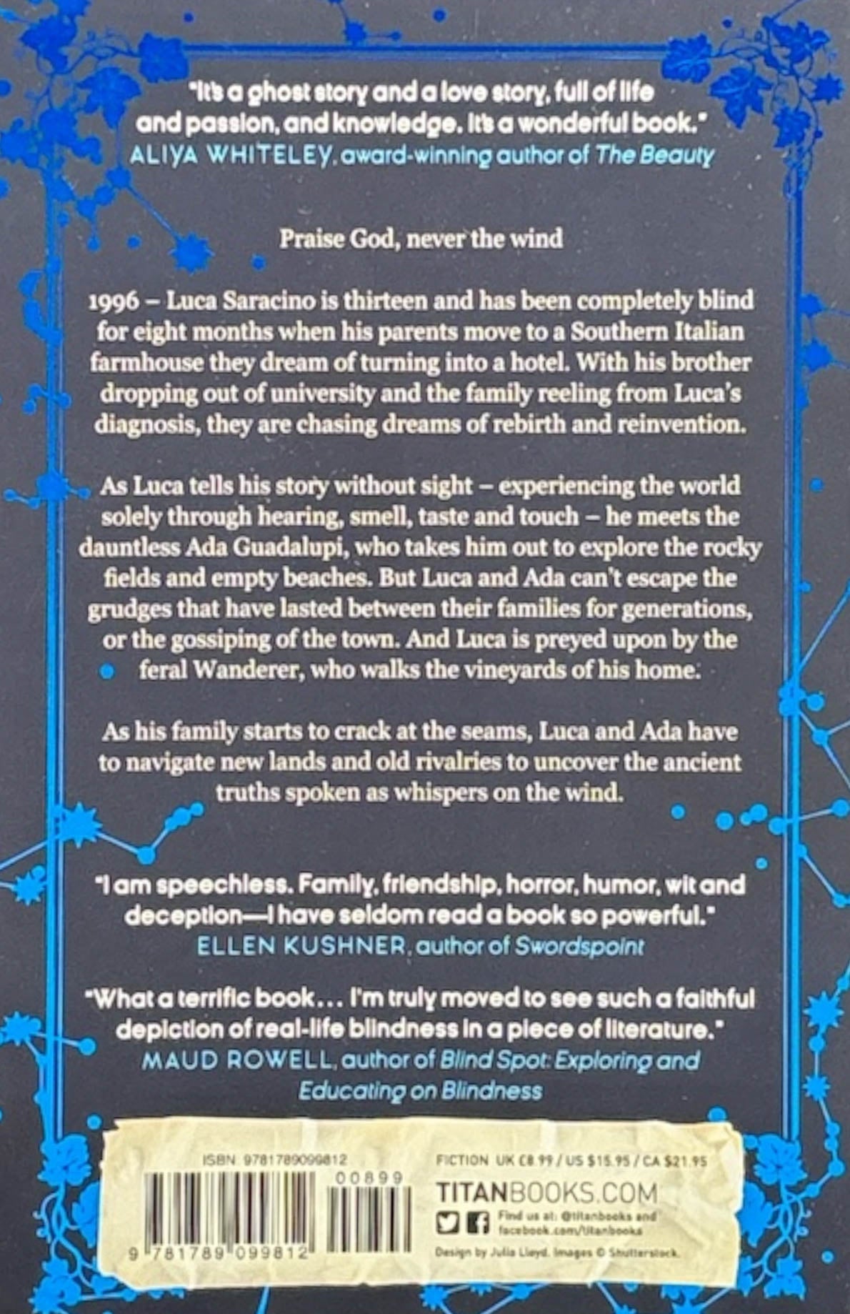 A bittersweet gothic fantasy of family, friendship, memory, and the uncanny told from the perspective of a blind teenager in Puglia, Southern Italy, set in the same world as The Book of Hidden Things, perfect for readers of Neil Gaiman, Donna Tartt and Haruki Murakami. Praise God, never the wind 1996 - Luca Saracino is thirteen and has been completely blind for eight months when his parents move to a Southern Italian farmhouse they dream of turning into a hotel. With his brother dropping out of university and the family reeling from Luca’s diagnosis, they are chasing dreams of rebirth and reinvention. As Luca tells his story without sight - experiencing the world solely through hearing, smell, taste and touch - he meets the dauntless Ada Guadalupi, who takes him out to explore the rocky fields and empty beaches. But Luca and Ada find they can’t escape the grudges that have lasted between their families for generations, or the gossiping of the town. And Luca is preyed upon by the feral Wanderer, who walks the vineyards of his home. As Luca's family starts to crack at the seams, Luca and Ada have to navigate new lands and old rivalries to uncover the truths spoken as whispers on the wind.